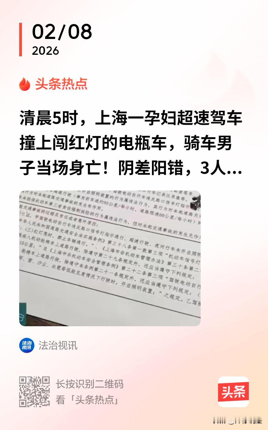 上海,一怀有六个月身孕的女子突感不适,情急之下独自驾驶丈夫轿车上路,赶往医院。经过一处路口时,一骑着电动自行车的男子闯红灯疾驰而过。女子刹车不及,猛烈撞击下,男子当场身亡。事后查明,女子车速高达95公里/小时,属于超速;而男子不仅闯红灯,电动车也超速且未开车灯。更复杂的是,这辆车在事发前一天刚过户给丈夫的朋友,尚未实际交付,且保险早已过期。悲痛之余,男子家属将女子及其丈夫和朋友一并告上法庭,索赔百万。法院这样判决。   2024年12月11日凌晨五点,怀有六个多月身孕的高某突然感到一阵强烈不适,担心腹中胎儿的她,来不及叫醒熟睡的丈夫,抓起车钥匙便独自驾车前往医院。   道路上车辆稀少,高某驾驶着丈夫潘某名下那辆白色轿车,沿着空旷的道路行驶。   她心里焦急,并未留意车速表上指针已悄然越过限速标志,其时速高达95公里。   就在途经一个十字路口时,一道黑影突然从右侧闯入视线。   “砰——”剧烈的撞击声把高某吓坏了。   高某猛踩刹车,车辆滑行十余米才停下,她颤抖着推开车门,只见一辆电动自行车倒在不远处,骑车人躺在湿冷的路面上,一动不动。   警方和救护车很快赶到现场,经确认,电动自行车骑行人陈某已当场身亡。   调查人员测量发现,陈某骑行时速为21公里,超过电动自行车限速标准。   更关键的是,路口监控显示,陈某通过时,信号灯为红色。   高某后来在陈述时回忆:“我看到他时,人已经在路中间了,像个黑色影子。天还没完全亮,又下着雨,真的很难看清。”   她同时坦言,自己并未意识到当时已经超速。   事后,交警部门出具了事故责任认定书,陈某骑行电动自行车违反路口信号灯指示通行、超速行驶、夜间行车未开启照明装置,承担事故主要责任;高某因超速行驶,承担事故次要责任。   随着调查深入,一个意外情况浮出水面,高某驾驶的这辆车,在事故发生时竟是一辆“脱保二手车”。   更令人意外的是车辆所有权状态,原来,就在事故发生前一天,车主潘某刚刚将这辆车过户给朋友沈某。   双方已办理登记变更手续,但车辆尚未实际交付,车钥匙仍在潘某手中,车辆也停放在原处。   潘某解释:“因为换了手机号,没接到保险公司的续保通知,直到出事了,才知道保险已经过期。”   这一连串巧合,让原本相对清晰的责任划分变得复杂起来。   死者陈某的家属将高某、潘某和沈某三人一并告上法庭,主张几人高达百余万元赔偿。   法院会如何判决呢?   《民法典》第二百二十四条规定,动产物权的设立和转让,自交付时发生效力,但是法律另有规定的除外。   第二百二十五条规定,船舶、航空器和机动车等的物权的设立、变更、转让和消灭,未经登记,不得对抗善意第三人。   法院指出,机动车所有权转移,应以交付作为物权变动的生效要件,而非单纯以登记作为唯一依据。公安机关的车辆登记管理,系出于行政管理需要,具有公示效力,但其本身并不创设物权。   本案中,潘某与沈某虽已办理所有权转移登记,但双方均确认,车辆并未实际交付,车、钥仍由潘某占有、控制。   法院认为,该车辆的占有、使用、收益权能并未发生转移,潘某仍是该车的实际支配者与运行利益享有人。   《机动车交通事故责任强制保险条例》第二条、第十条之规定,道路上行驶的机动车的所有人或管理人,应当依法投保交强险。   本案中,作为车辆实际支配人和运行利益享有人的潘某,理应负有确保车辆在道路行驶前已投保交强险的法定注意义务。   法院进一步认为,潘某“因更换手机未接到通知”的抗辩,属于自身对法定义务的疏忽,不能免除其作为投保义务人的责任。   而沈某,因其尚未成为车辆的实际控制人,无法履行投保、管理之责,故不应对此承担法律责任。   结合最高法《关于审理道路交通事故损害赔偿案件适用法律若干问题的解释》第十六条第一款之规定,投保义务人潘某应在交强险责任限额范围内与侵权人承担连带责任。   《道路交通安全法》第七十六条第一款第(二)项规定,机动车与非机动车驾驶人之间发生交通事故,非机动车驾驶人有过错的,根据过错程度适当减轻机动车一方的赔偿责任。   同时,《民法典》第一千一百七十三条规定,被侵权人对同一损害的发生或者扩大有过错的,可以减轻侵权人的责任。   法院进一步指出,本次事故经公安机关依法认定,死者陈某骑行电动自行车“违反路口信号灯指示通行、超速、夜间未开启照明装置”,其行为是导致本次事故发生的主要原因,而高某驾驶机动车“超速行驶”,其行为是导致事故发生的次要原因。   基于此,法院酌定机动车方高某承担40%的赔偿责任,潘某则在交强险责任限额范围内即180,000元与高某承担共同赔偿责任。   最终,法院判决高某需赔偿837296.80元,潘某在18万元交强险限额内与高某承担共同赔偿责任。   对此,您怎么看?