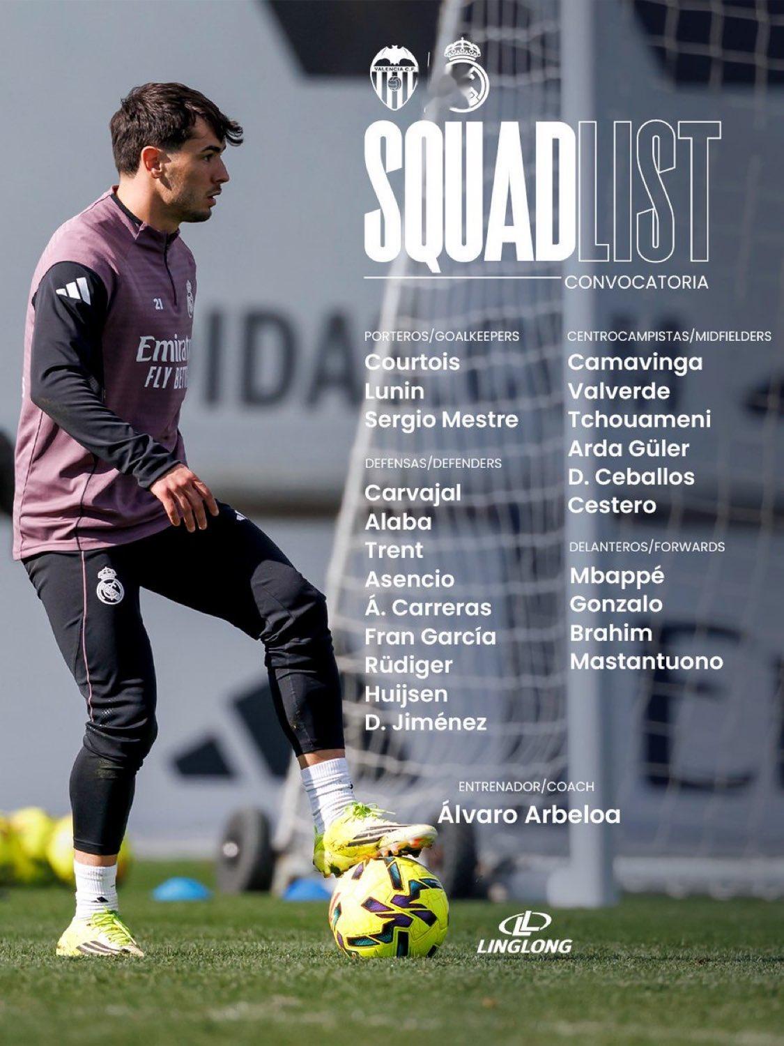 皇马vs瓦伦西亚大名单:维尼修斯停赛;阿诺德,吕迪格回归