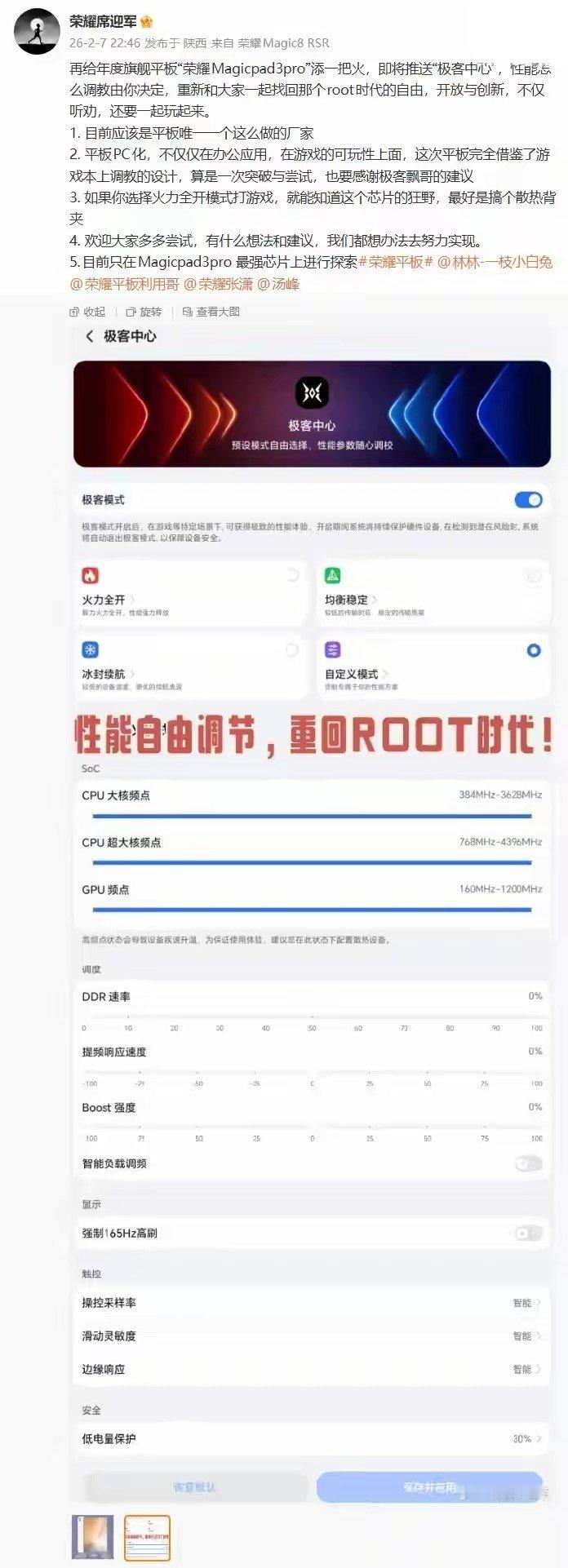 【荣耀年度旗舰平板MagicPad3 Pro将推极客中心,可自由调节性能】