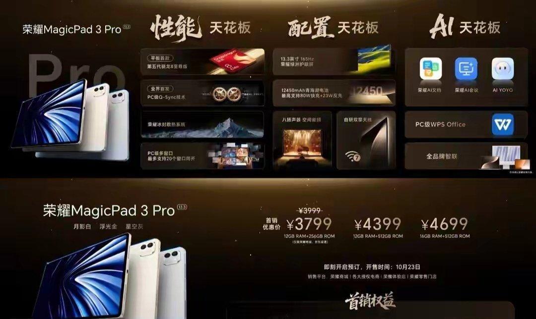 荣耀 MagicPad 3 Pro 旗舰平板发布于去年 10 月,是首款搭载第五代骁龙 8 至尊版的平板电脑,提供月影白、星空灰、浮光金三种配色及 12+256GB、12+512GB、16+512GB 三个存储版本可选,售价 3799 元起。