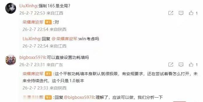 有网友询问强制 165Hz 高刷是否为全局?席迎军给出肯定答复:“对。”还有网友询问可以直接设置功耗墙吗?席迎军表示:“这个平板功耗墙本身默认就很极限,有安规要求,还在尝试着看怎么打开,未来会持续迭代,这个只是 1.0 版本。”