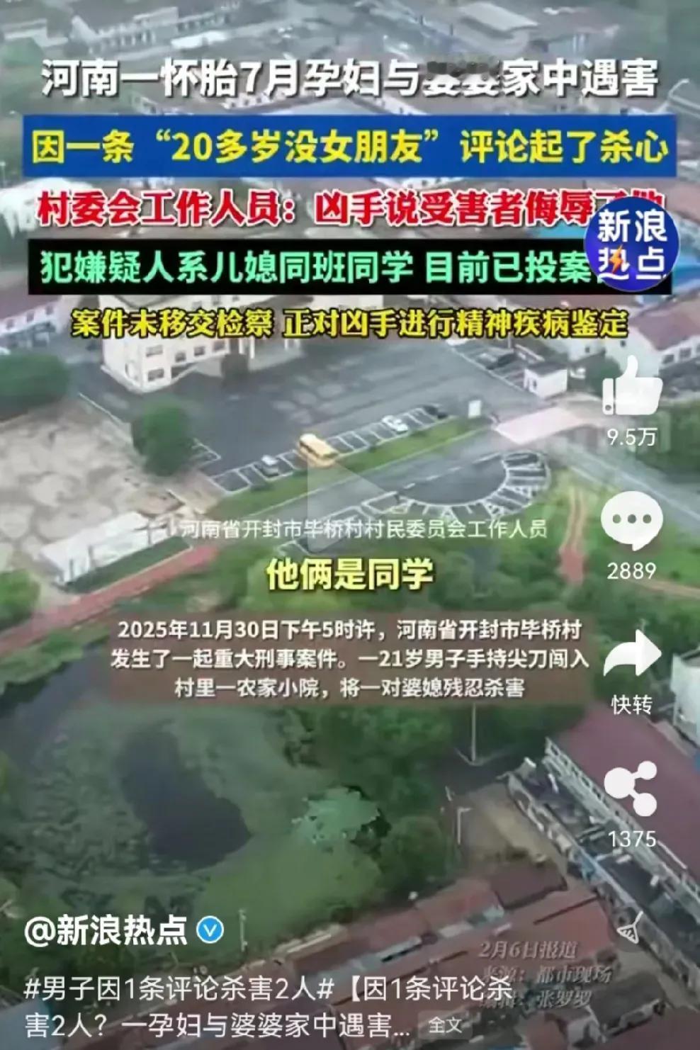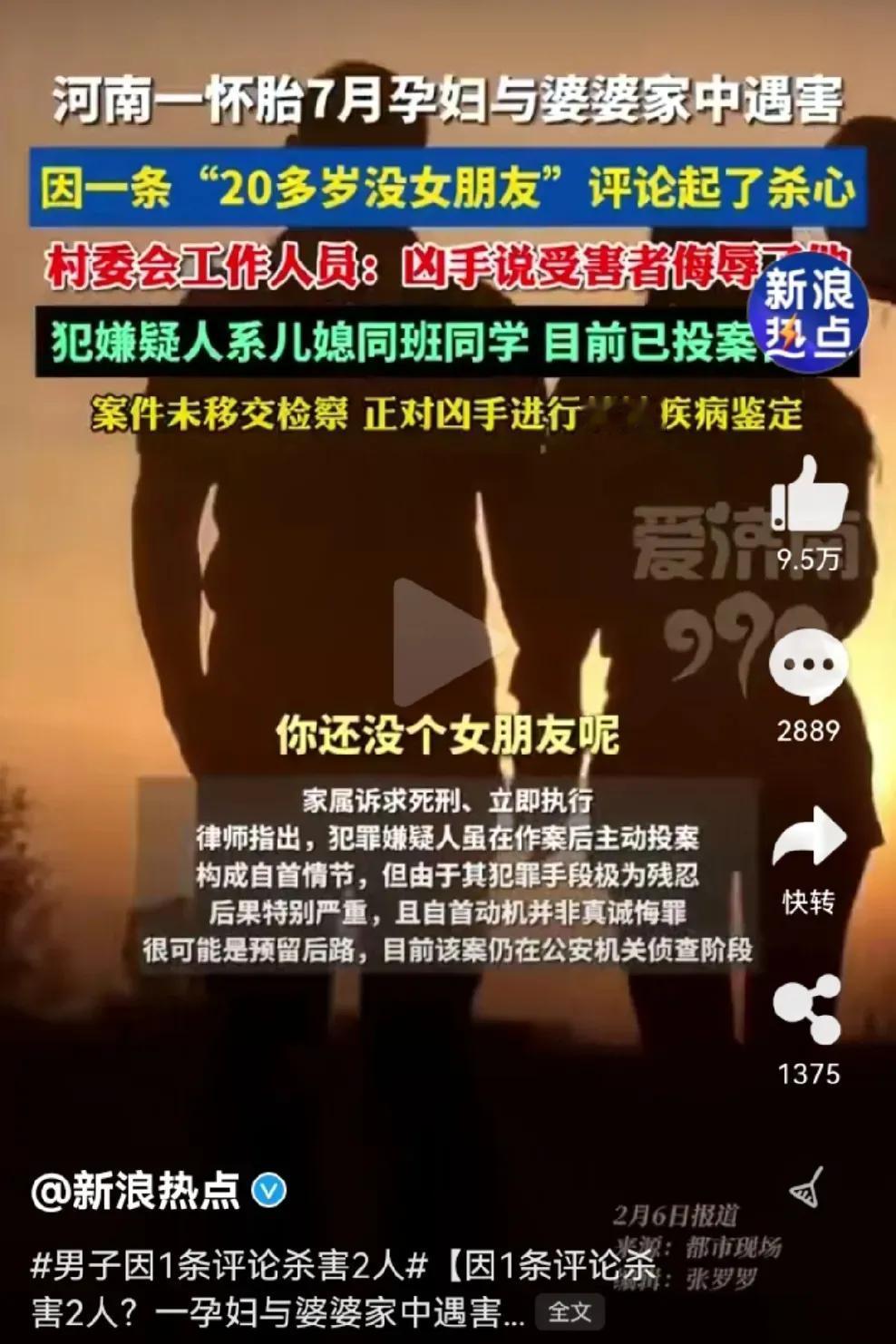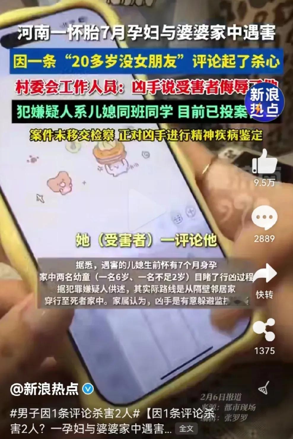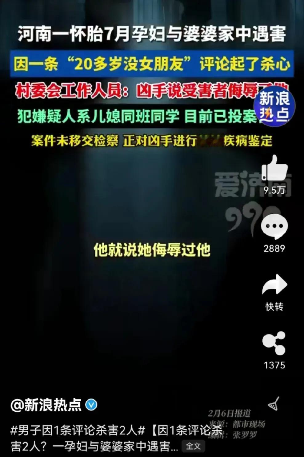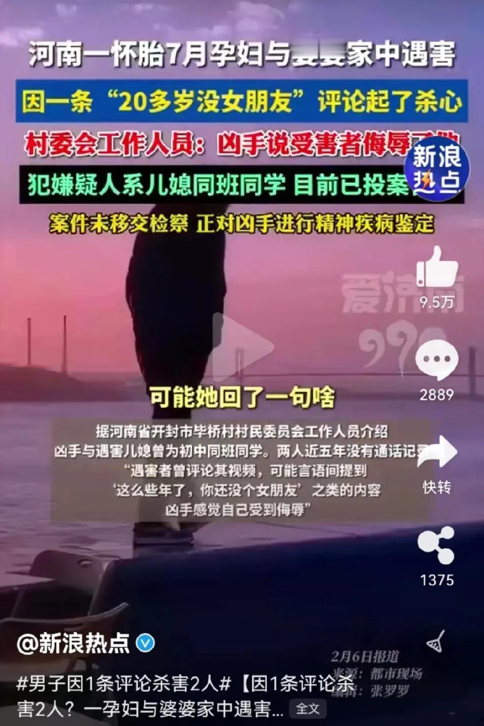 河南一21岁小伙,看到孕妇评论区调侃“这么多年了,你还没有个女朋友”,气急败坏之下怒火中烧,悲剧发生了,孕妇和她婆婆丧命了。 这两人是什么关系呢?原来两人是初中同学,在校期间关系普通,五年未联系过,路上偶遇打过招呼,算是点头之交。 没想到今天竟然会发生如此惨烈的后果。要说这孕妇也挺倒霉的,本来开个玩笑而已,你就不能当没看到,当没听到吗?非要较真儿吗?这较真儿可好,三个家庭都得毁在这里了。 男子解气了,别人看不下去了,都替他骂娘了,你一句话把他骂成这样,婆婆和孩子埋了谁来负责呢?要说这孕妇也是有心没心,开个玩笑不就是调侃一下吗? 这男的能娶到媳妇儿,能当爹不也是你没看出来的潜力股吗?你当这是哪个时代了,现在男大当婚女大当嫁,不都是看眼缘吗?你这么看不起他,难道不是你眼拂了金吗? 这男子也是太窝里横了,一句玩笑话就能把你骂成这样,你到底是心有多虚啊!三十年河西三十年河东,谁能保证谁以后就混得好呢? 我看还是这孕妇看得起你,人家都能和你打招呼,你倒好,见了面直接就当没看见,这不是人家给你留面子吗? 人家开个玩笑,也不是嘲笑你嘛,就当给你提个醒,告诉你一声,这可是潜力股啊,以后有机会你可别错过了。 这不就是你自找没趣吗?太可惜了,这么一句话,三个家庭都得散伙了,你一句话就把他们骂成这样,那你现在呢? 一句话就能把别人骂成这样,你就不怕别人一句话把你骂死吗?做人还是低调点好,多做好人好事,别太逞英雄。 麻烦各位看官老爷们右上角点击一下“关注”,既方便您进行讨论和分享,又能给您带来不一样的参与感,感谢您的支持!
