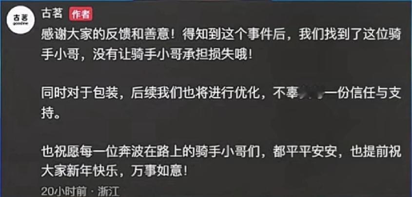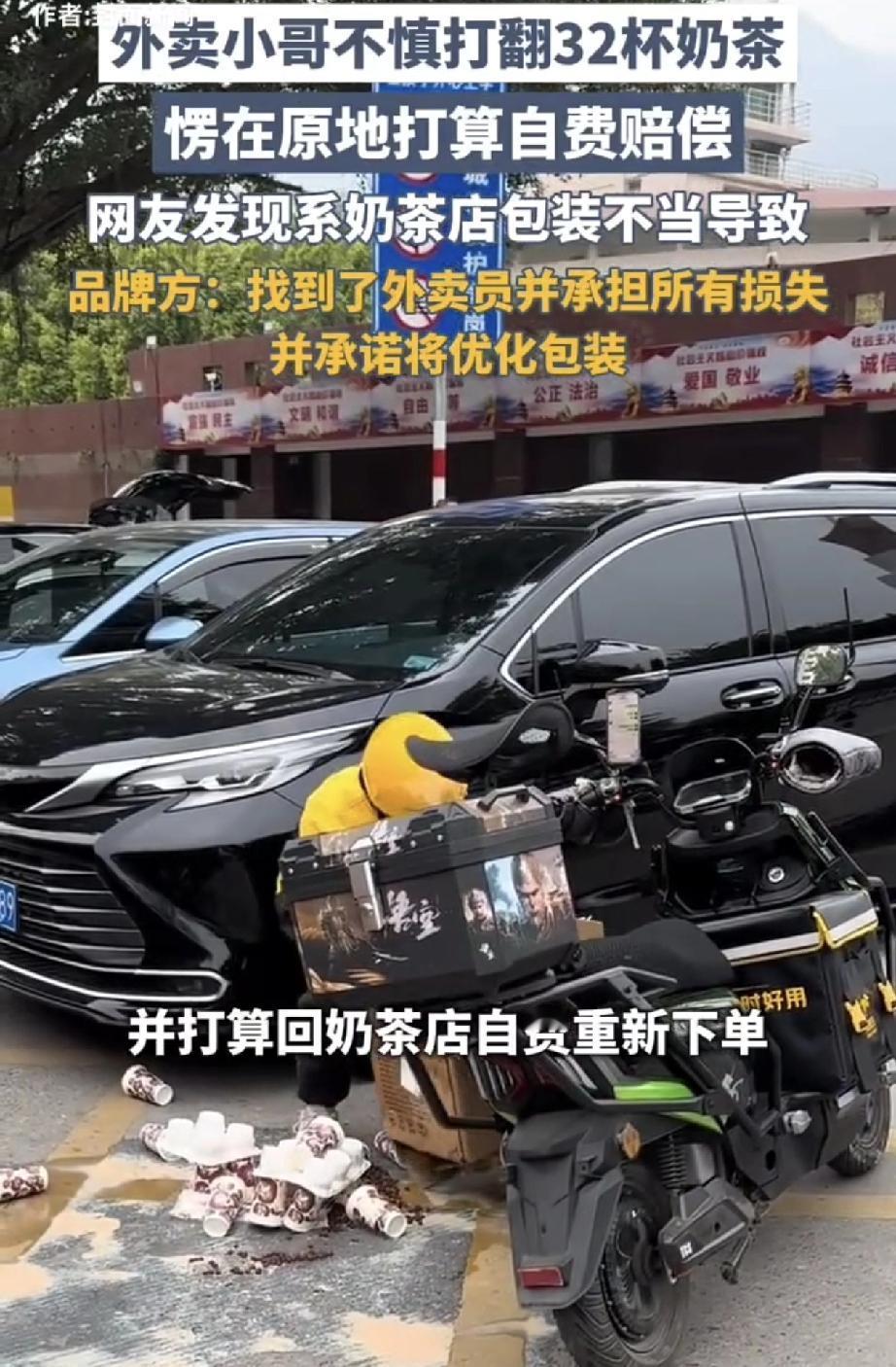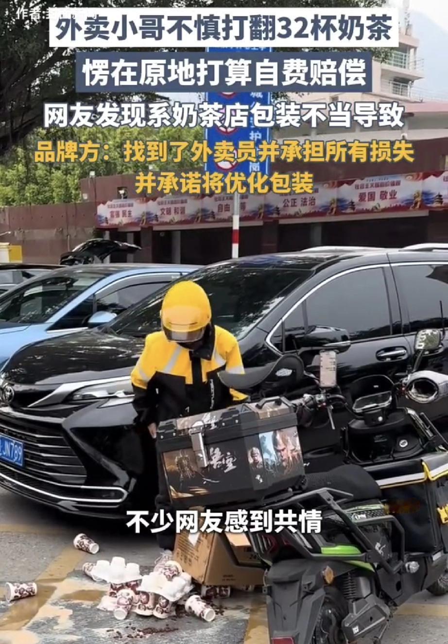 这波流量被接住了!福建莆田,一外卖小哥送单过程中,不小心打翻了32杯奶茶,看着这地上的狼藉,小哥拿着手机愣在了原地。回过神来的小哥,也是很快就打电话给顾客说明原因,并有担当的表示,回去奶茶店自费重新下单。而有人将小哥手忙脚乱收拾散落一地奶茶的这一幕发到网上后,也让不少网友感到心疼。不过品牌得知此事后,迅速找到了这名外卖小哥,并且承担了这次事件所有损失的做法,赢得了网友点赞和认可。 原来,这段视频发到网上,有眼尖的网友发现,小哥打翻的奶茶是古茗品牌,而奶茶打翻也不完全是小哥的问题,主要还是因为奶茶的包装出现了问题,于是不少网友在评论区艾特古茗品牌方。 而品牌方也没让网友们失望,他们看到此事后,便迅速找到了这名外卖小哥,并且承担了这次事件的所有损失,并表示后续会优化包装问题。 后续结果让人暖心,这网友不但纷纷为有责任有担当的小哥表示点赞,也是对品牌方的善良表示点赞和认可,更有不少网友表示,这奶茶可以点,以后只喝古茗了! 不得不说,有担当的小哥没有赔偿,善良的品牌方也得到了大家的认可,结果很温馨。但试想一下,如果真让小哥来赔偿,这32杯奶茶,一杯就算10元,也要赔320元钱呀,估计两三天都白干了。所以奶茶品牌方真心不错,而这波流量更是被他们接得稳稳的!有时间也来一杯尝尝[大笑]