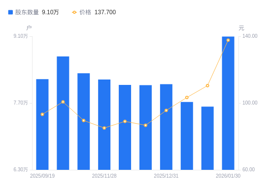 日期A股户数(户)流通A股户均持股数(股)户均持股市值(万元)2026-01-30909583163.1643.562026-01-20762603772.8141.672026-01-09772193725.9538.512025-12-31809633553.6533.972025-12-19807593562.6330.892025-12-10808063560.5631.702025-11-28819373511.4129.872025-11-20832623455.5330.952025-09-30867803308.7833.332025-09-19820143501.0632.65