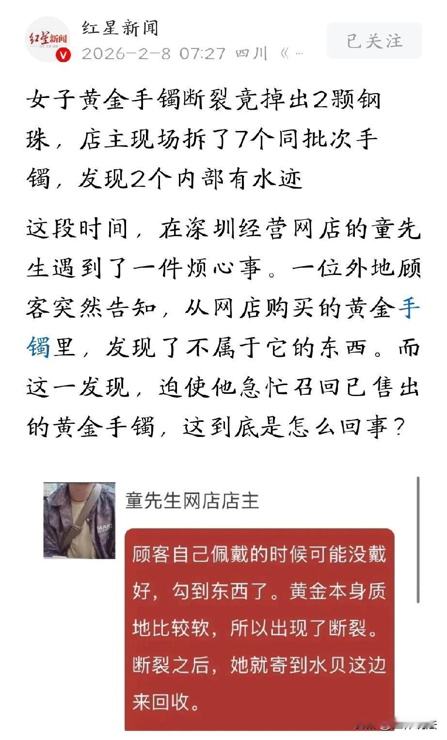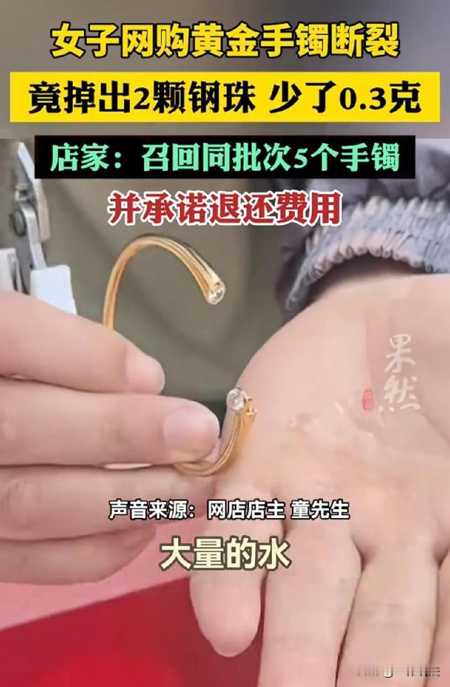 广东深圳,顾客在网上买了一只金手镯,结果没戴几天,就出现断裂。顾客很闹心,将手镯送去回收准备变现,万万没想到,手镯剪开后,竟从里面滚出来两颗钢珠,有0.3克。金子变成了钢珠,顾客接受不了,怀疑店里售假,马上联系了老板。老板大吃一惊,紧急召回了卖出去的5只手镯,并第一时间给顾客退款。老板一一查验该批手镯,结果又发现了新问题。 童先生开了一家网店,专门卖黄金首饰,最近,他被一桩棘手的售后问题搅得心烦意乱。 一位外地顾客在他的店里下单了一件黄金手镯,原本想着能戴上喜庆喜庆,可没高兴几天,手镯就出现了断裂。 看着断裂的手镯,顾客特别闹心,金子虽然软,但也没这么娇气吧,自己都是正常佩戴,还十分爱惜,没想到这么快就坏了。 好在金价没有跌,为了眼不见心不烦,顾客干脆把手镯拿到去水贝回收点,准备变现。 万万没想到,就在工作人员剪开手镯检查,里面居然掉出了两颗钢珠,就因为这两颗钢珠,手镯的实际黄金克重少了0.3克。 这下,顾客彻底傻眼,这可不是质量问题了,用钢珠假冒金子,妥妥的欺诈。 于是,顾客赶紧联系童先生说明了情况,并发去了回收时的监控和拆剪视频。 看完视频后,童先生后背直冒冷汗,视频里清清楚楚能看到钢珠从断裂的手镯里滚出来。 他经营网店这么久,一直注重产品质量,以前从未出现过这种情况,这可非同小可。 他赶紧联系了委托加工的工厂,询问是不是他们在生产过程中出了问题,往手镯里塞了钢珠。 但工厂那边一口咬定,他们绝对没做过掺假的事,做生意做讲究诚信,不会弄虚作假砸自己的牌子。 对于网店来说,信誉就是生命线,一旦顾客对产品质量产生质疑,店铺的口碑就会受到极大影响。 工厂不认账,童先生只能自己想办法解决。 为了弄清这批手镯到底有没有普遍问题,也为了维护店铺信誉,他决定启动召回程序。 他联系了之前买了同批次手镯的顾客,耐心地向他们解释情况,召回了已售出的手镯进行检查。 在他的努力下,卖出去的9只手镯,成功召回了5只,再加上仓库里剩下的同批次的2只,一共凑齐了7只手镯,准备详细检查。 2月6日上午,童先生当着记者的面拆开了装有召回手镯的快递包装,他把7只手镯挨个放在桌上,仔细地查验起来。 经过一番检查,7只手镯里没再发现钢珠,但是其中2只手镯的内部残留着水迹。 这个结果,让他既松了一口气又有些疑惑,按照正常工艺,手镯加工的时候会先吹干再镶嵌,而且这都过去这么久了,怎么还会有这么多水留在里面,这肯定不对劲。 虽然现场没查出钢珠,但童先生并没有打算敷衍顾客。 依据《消费者权益保护法》第五十五条规定:经营者提供商品或者服务有欺诈行为的,应当按照消费者的要求增加赔偿其受到的损失,增加赔偿的金额为消费者购买商品的价款或者接受服务的费用的三倍;增加赔偿的金额不足五百元的,为五百元。 童先生销售的黄金手镯内部暗藏钢珠,导致实际黄金克重不足,属于以假充真、隐瞒真实情况的消费欺诈行为。 顾客基于对“纯金手镯”的错误认知完成购买,完全符合该条适用条件。 所以,顾客有权要求退货退款,并可主张货款三倍的惩罚性赔偿,即便童先生主观不知情,作为销售者仍需先行向消费者承担全部民事责任。 所以,他主动给那位投诉的顾客打了电话,一五一十地说了查验结果,诚恳地向顾客道歉,还承诺全额退还货款。 算下来,这次召回、退款等损失,童先生估计自己得亏两万多块钱。 从产品责任与市场监管角度,该行为同时违反《产品质量法》禁止“掺杂、掺假、以假充真”的规定。 童先生虽主动召回、全额退款以降低损失,但不免除其法定赔偿义务。 若查实工厂存在掺假,童先生可在赔付消费者后,向委托加工方追偿全部损失,监管部门也可依法对涉事生产、销售主体作出行政处罚 。 不得不说,童先生还是很讲信用,守规矩的,为他的担当点赞。 为何制假现象如此普遍,希望有关部门加强打击和监管,切勿纵容。