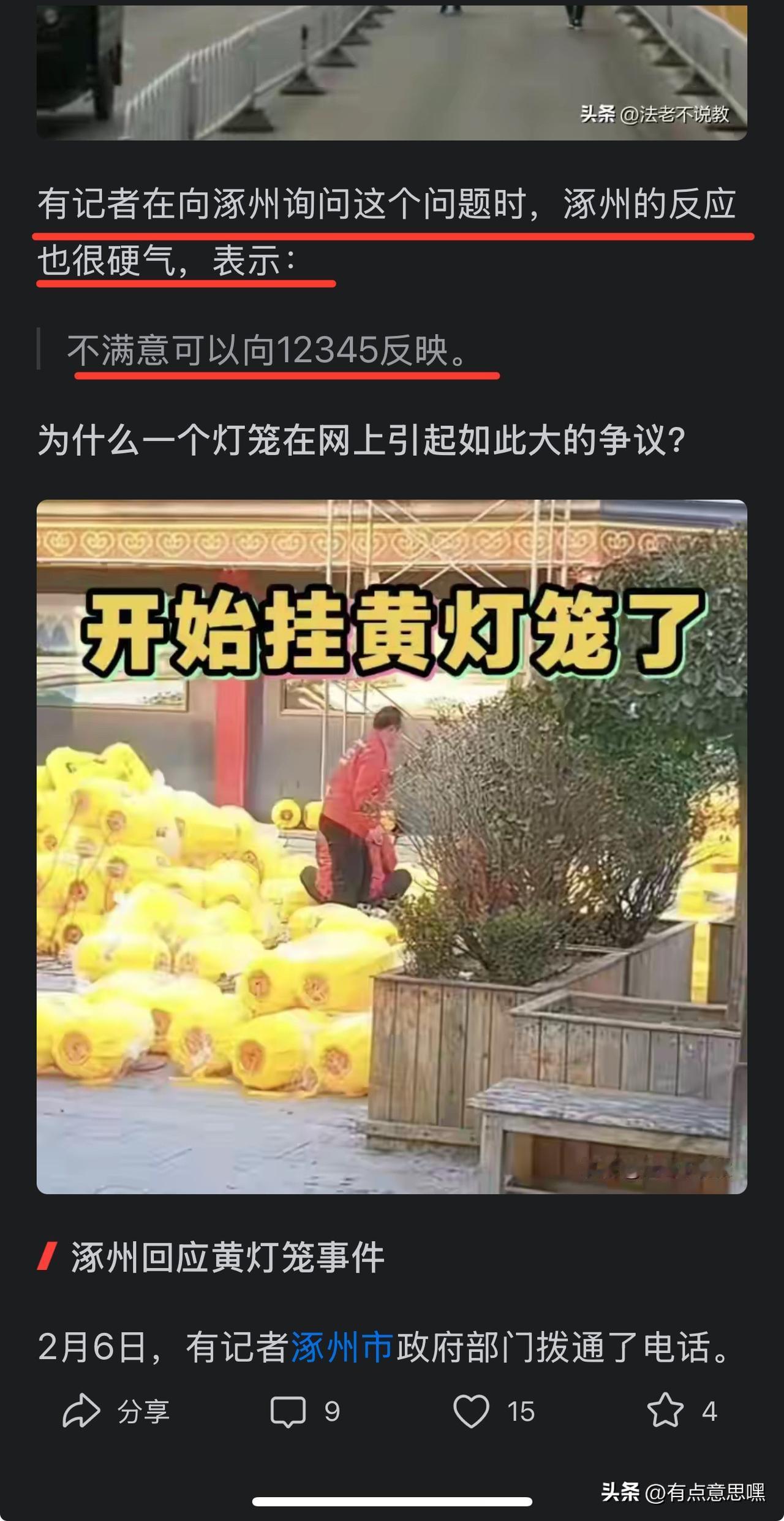 再说说这件事中不可思议的地方 众所周知,中国的春节,看清楚,不是清明节,都是悬挂大红灯笼,尤其是在春节将至,生产灯笼的厂家肯定是加班加点的生产,那么既然咱们国家没有悬挂黄灯笼的习俗,那么他们为何一下生产出如此大批量的黄灯笼? 如果不是有人下了大订单,我想没有那个老板在目前经济低迷的时候敢投入大批资金去生产一个没人需要的产品。 再说回悬挂,在中国,你想随便悬挂一个醒目的东西,是可以任意随便挂到户外吗?尤其是这种集中、大规模的在重要的街道、空中、标志物上悬挂。这不仅仅是市容管理就有权力决定的吧。 所以,这才有了涿州市政府对市民硬气的回应: 不满意?去打12345反映吧。 ————————————