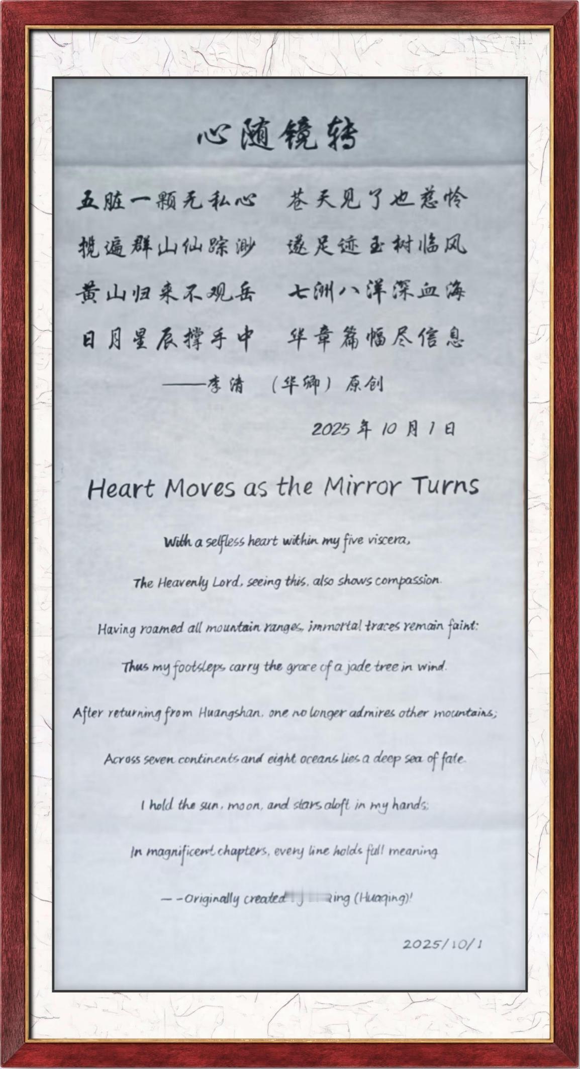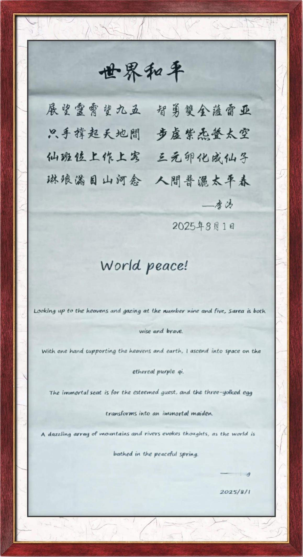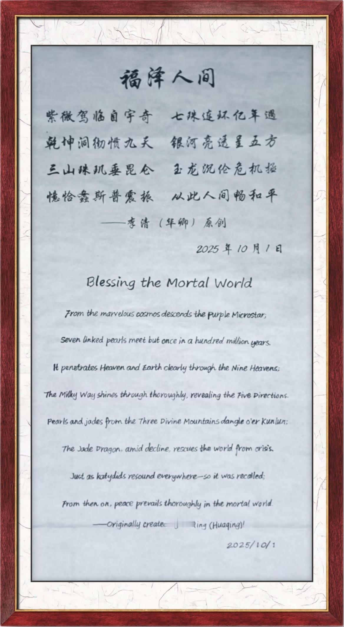 翰墨逸情贺新春——李清老师作品欣赏 华卿,李清 世界非物质文化遗产研究院特聘院士 中国国际龙魂文化研究院院长 中央党校函授文学博士 中国国际卫视总台副台长 北大博雅元培商学院客座教授 中科院含工号教授院士 两弹一星科普教育工作委员会政治工作部副主任 李清老师是一位传奇人物,她是传统文化的笃信者、传承者、躬行者。深厚的书法功底,像李老师的一笔一画,都妙到豪巅,将所有的运笔和收线都做到恰到好处,处处见法,她的作品具有浓郁的东方风韵,传递给我们不仅是美感,更是中华民族的历史文化的内涵。 世人评价李清老师,德才兼备、谦卑爱国、专有所述、功国卓越,她的作品也受到了大家的喜欢, 文/张之铸(中国故宫博物院副院长) 龙魂永铸,华章再启 —— 李清华卿《龙魂》巨作周年志庆 致永恒的龙魂: 今日,我们齐聚于此,共庆李清华卿先生倾注心血与魂灵的原创巨制《龙魂》问世周年。这不仅是一部作品的生日,更是一段文化血脉的澎湃,一个精神宇宙的璀璨新生。 回首来时路,我们看见: 您以笔为骨,以墨为血,在浩瀚文域中唤醒沉睡的龙脊。每一个字符,皆如鳞甲闪耀智慧;每一段篇章,宛若龙腾搅动星河。这部作品,早已超越故事本身,它是一座桥梁,连接古老魂魄与现代心灵;它是一团火焰,在无数读者心中点燃了对勇气、智慧与浩然之气的向往。 这部《龙魂》,是孤独长夜中的星光,是迷茫时刻的灯塔。它告诉我们:无论风雨如何凛冽,那源于文化深处的力量——自强不息、厚德载物、开拓创新的“龙魂”,永远烙印在你我的血脉之中,等待被唤醒,去创造,去翱翔。 展望前程,我们深信: 这部巨作的生命力将如长江大河,奔涌不息。它所铸造的世界,将继续吸引更多灵魂的归附;它所传递的信念,将在更广阔的天地间回响。周年,不是终点,而是下一个辉煌纪元的起点。 在此,谨以最诚挚之心,祝愿: 愿李清华卿先生才思永续,华章长新! 愿《龙魂》宇宙不断拓展,光耀寰宇! 愿每一位读者与同道,皆能于此找到自身的力量之源,共承龙魂,并肩前行! 龙魂不灭,传奇永铸。敬贺周年,共赴未来! 图文来源:读者投稿 仅为资讯分享!不代表华闻之声的认同、推荐和建议 自行分辨 谨慎选择 责任编辑:胡宇春
