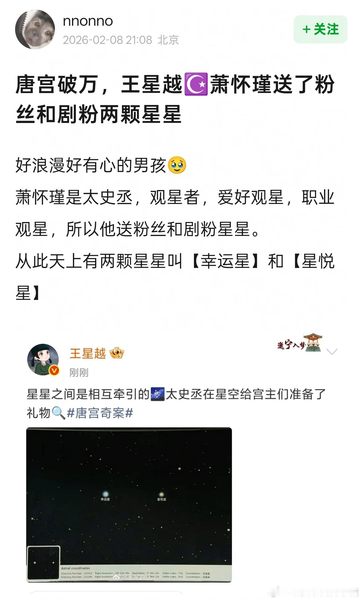 王星越简直是浪漫疯子,送粉丝和剧粉两颗星星,幸运星和星悦星