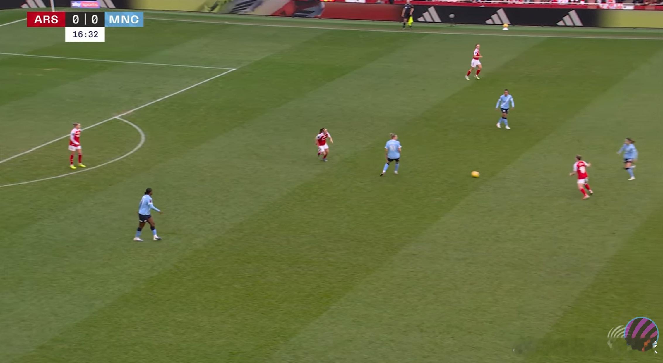 barclayswsl Miedema在前场的防守站位稍微有些疏忽,既没有完全压上,也没有完全覆盖身后的点,被阿森纳轻易通过传球打破了第一道防线。曼城中场组合長谷川和Blindkilde的移动防守能力其实不在WSL前三位,需要前场Bunny和Miedema的反复回撤掩护。曼城第一道防线被打透,中场和后卫就成了站位摆设,防不住阿森纳的快速通道传球。山下应该有预判,冒险出禁区协助Knaak破坏 Smith的突破,在之后的比赛中她有改进。下半场,曼城应该用Sam Coffey换下Blindkilde增强中场防守强度,并用Clinton替下Kerolin,吸引火力,为Bunny制造空间,Kerolin在关键比赛中对体系的战术作用很小,她最适合快速反击。上半场,Bunny+Miedema与Hemp、Kerolin的左右两侧配合完全被阿森纳切断了。阿森纳上半场战术完胜曼城。