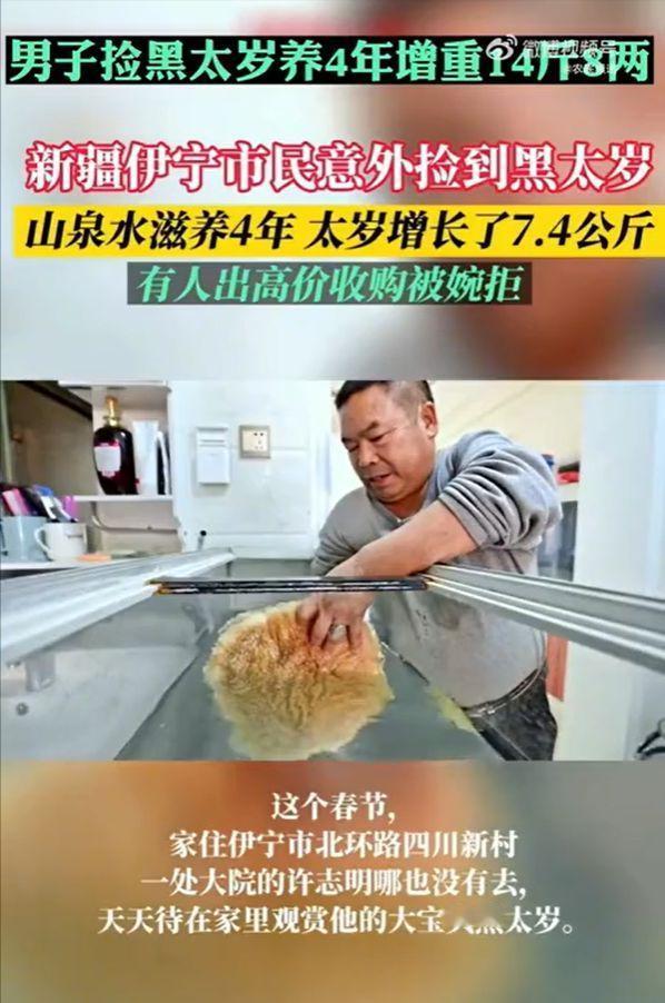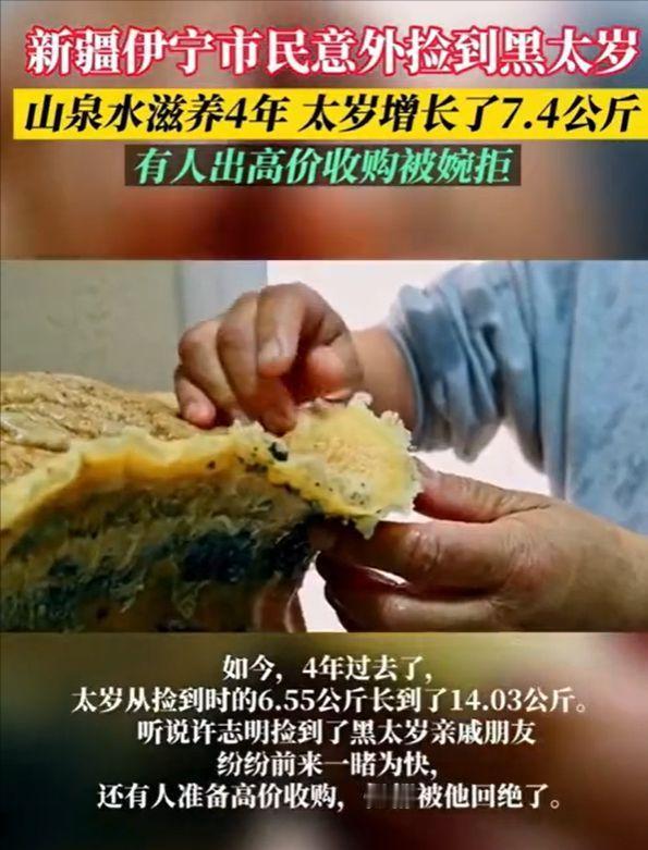 [送心]2018年,新疆一男子捡到了一块6.55公斤“黑太岁”,有人愿意出85万高价收购,他竟然给拒绝了,4年时间,黑太岁重量又增长14斤多,他表示已经养出了感情。 2018年的那个午后,走着走着,一块与周围灰白色砾石格格不入的黑色物体,映入了他的眼帘。 老许弯腰捡起,指尖瞬间传来不一样的触感——既不像石头那样坚硬冰冷,也不像普通泥土那样松散,质地介于皮革和海绵之间,表面布满了蜂窝状的孔洞,用手指轻轻戳一下,还能感受到明显的弹性反馈。 他掂了掂分量,不算轻,足足有6.55公斤,比同等大小的石头重上不少。 没见过这种东西的老许,没觉得它有多珍贵,只觉得模样奇特,想着捡回去给孩子当玩具也好,便随手将这块黑疙瘩塞进了随身携带的帆布工具包,转身继续巡查。 回到工地的简易板房,老许找了瓶矿泉水,小心翼翼地冲洗着这块黑疙瘩。 水流冲刷过后,原本黑乎乎的表面显露出深浅不一的纹路,宛如古树的年轮,藏着岁月的厚重。 老许凝视着冲洗净的黑疙瘩,将其小心揣入怀中进城去,径直前往当地玉石市场。他心中思忖,兴许懂行之人能洞悉这物件的来历。 玉石市场里,一位在这行深耕三十载的老板,接过老许递来的黑疙瘩。原本沉静的双眸瞬间闪过光芒,他粗糙的指腹反复摩挲疙瘩表面褶皱,神色愈发凝重。 老板仔细查看了许久,才缓缓开口,语气里满是惊讶,说这不是石头,也不是普通的菌类,而是罕见的活黑太岁,市面上极其稀少。 说着,老板掏出计算器飞速敲击,按克计价核算后,告诉老许,这块6.55公斤重的黑太岁,市值最少有85万,还当场提出,愿意支付现金收购。 彼时的老许,月薪只有四千块,这笔钱,相当于他在工地上辛辛苦苦搬二十年砖的收入,足够彻底改变他和家人的生活,让老家的日子过得宽裕起来。 可让人意外的是,老许沉默了片刻,缓缓摇了摇头,抱着黑太岁,坚定地拒绝了老板的提议,转身走出了玉石店。 老许的老家四川,祠堂的梁柱上刻着“万物有灵”四个大字。 祖父临终前,曾紧紧攥着他的手叮嘱,遇见活物要善待,那是天地借给你的伴儿,不能轻易辜负。 从那天起,老许便把这块黑太岁,当成了自己的“小伙伴”,悉心照料起来。 他特意打听得知,太岁适合用干净的山泉水养护,便每天往返五公里,到附近的山上背回天山雪融水,定期换水,保证水质新鲜,生怕照顾不周。 雨季的时候,他担心屋顶渗漏,弄湿养太岁的容器,特意给容器加盖了防水布; 寒冬腊月,天气寒冷,他又把饲养太岁的塑料桶,小心翼翼地移到暖气片旁,防止太岁受冻。 日子一天天过去,四年时间转瞬即逝,老许依旧坚持每天悉心照料着黑太岁。 这天,他特意给太岁称了重,惊喜地发现,原本6.55公斤的太岁,竟然增重了14斤8两,最终达到了14公斤,比当初捡到的时候大了一圈,摸起来也更加饱满有弹性,每年以近两公斤的速度生长,相当于每天都能新增54克生命物质。 这四年里,关于老许捡到黑太岁的消息,越传越远,陆续有不少买家找上门来,想要高价收购。 如今,这块14公斤重的黑太岁,就放在老许宿舍的窗台上,成了小区里的一道奇观。 每天清晨,晨练的老人路过,都会停下脚步,指点着太岁表面的菌丝脉络,惊叹不已; 放学的孩童,也常常趴在桶边,好奇地观察着气泡升腾,小声嘀咕着,说它在呼吸。 某中学生物教研组,得知这件事后,还将老许的宿舍,列为了校外实践基地,让学生们通过显微镜,观察太岁的细胞分裂现象,把课本上抽象的知识,变成了具象可感的认知。 老许也十分支持科研事业,定期将太岁的样本,寄给自治区微生物研究所的科研团队,协助他们开展研究。 回过头来看老许的选择,其实从来都不是“傻”,而是一份难得的坚守与善意。
