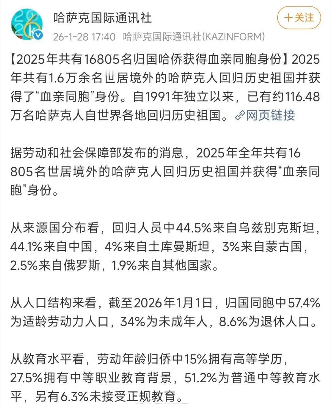 哈萨克斯坦吸引百万侨民归国,四成多来自中国。 (如图所示)世界最大的内陆国哈萨克斯坦地广人稀,采取了很多优惠政策吸引海外的哈萨克族侨民归国,效果明显,其中有四成多来自中国,是哈第二大侨民来源国,他们被俗称中哈。这个中哈对曾经养育过他的国家,表示尊敬,也算没有忘记这养育之恩。