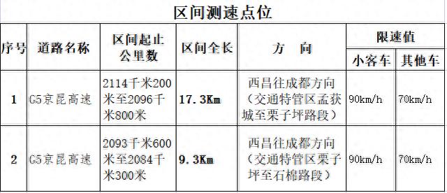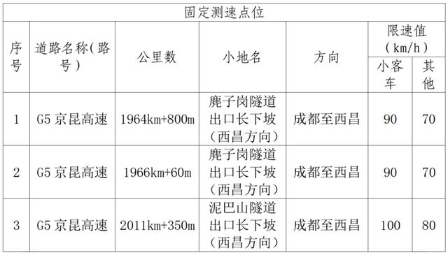 日前,四川高速公安六分局根据相关要求,已完成对G05京昆高速(雅西段)限速标志标牌更新和监控设备调整。现将G05京昆高速(雅西段)2036Km至2115km路段限速变更后,重新公示辖区现有交通技术监控设备如下: