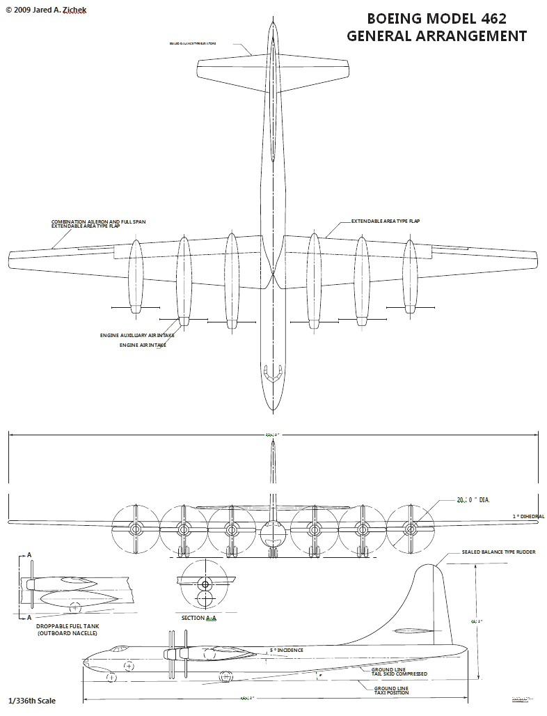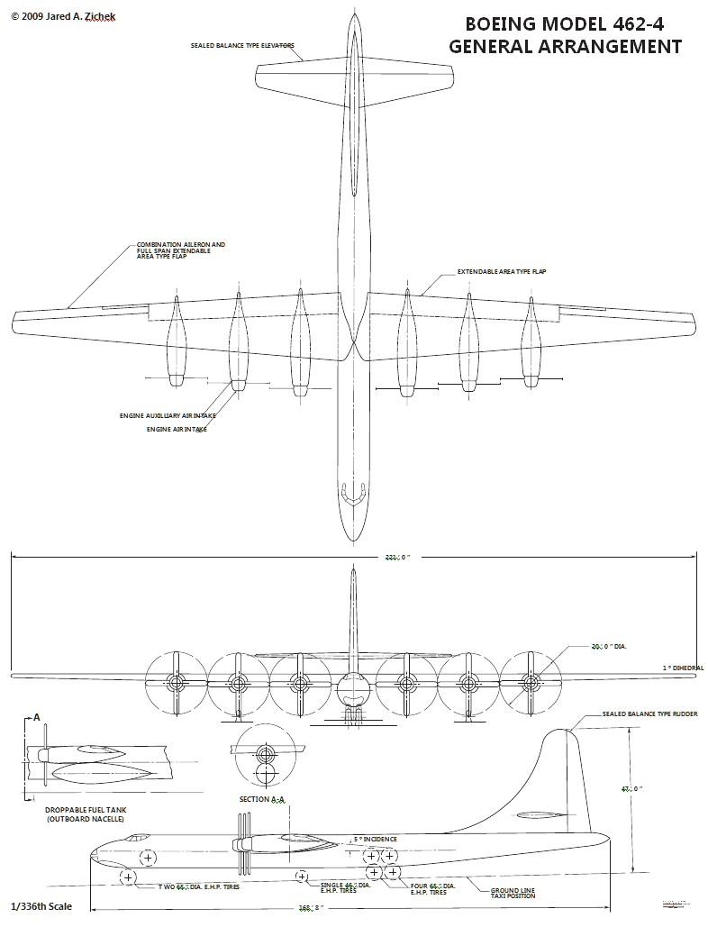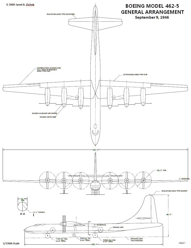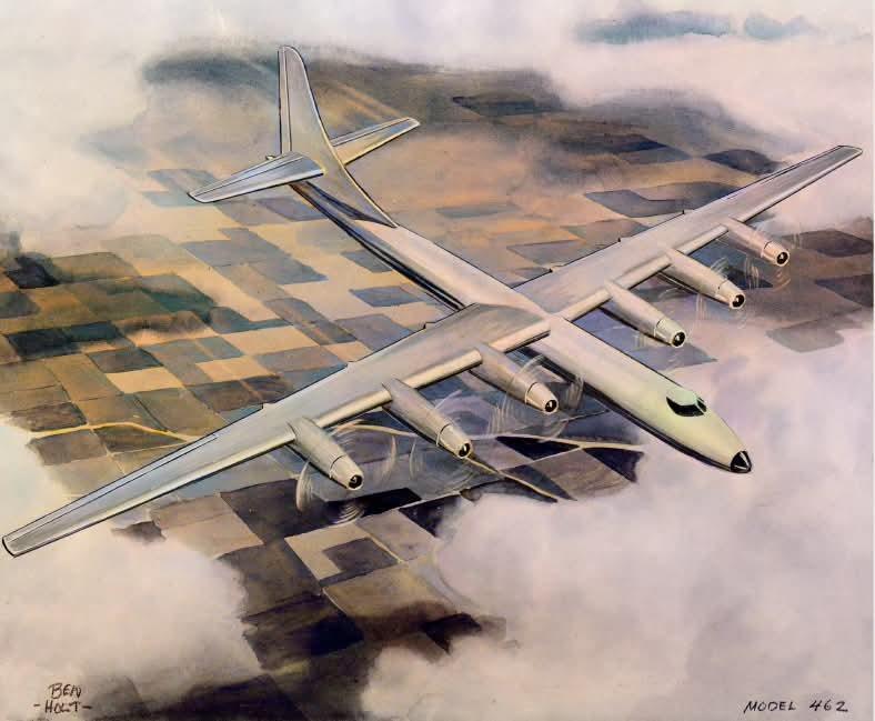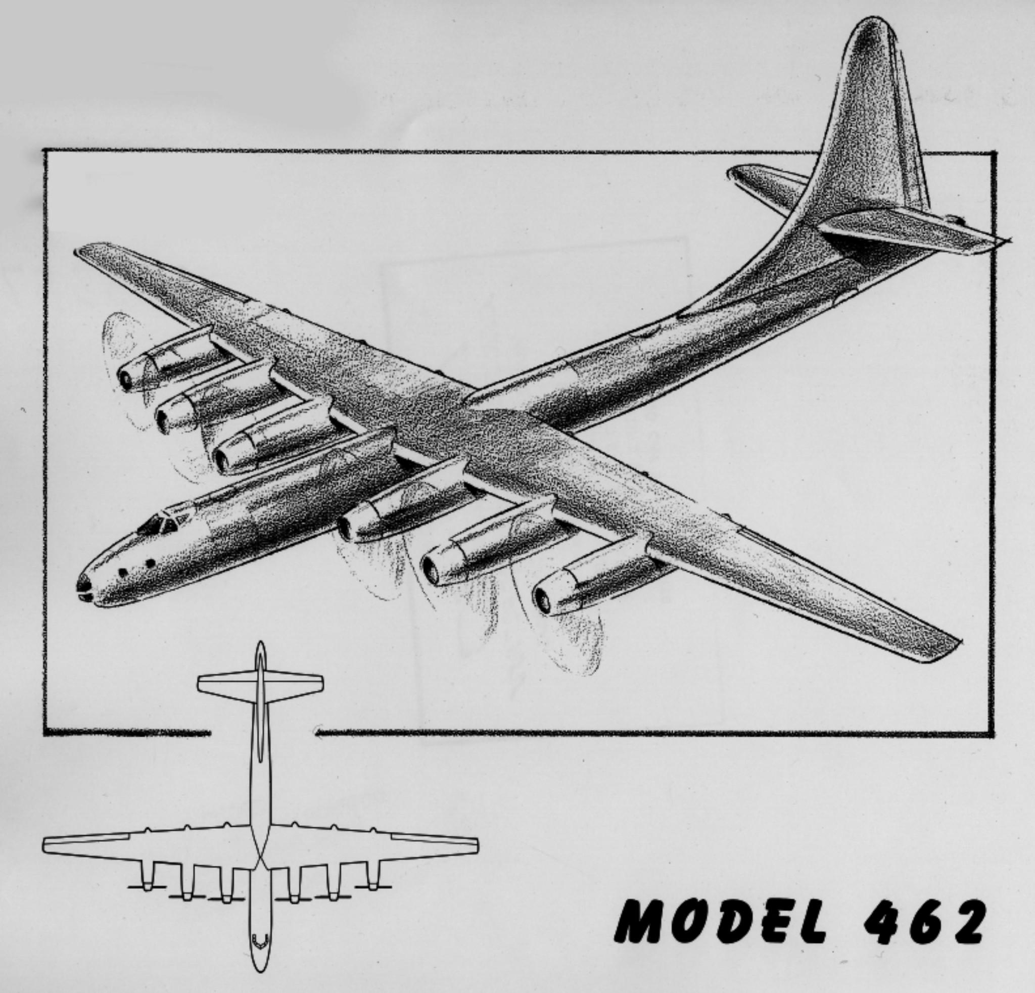 波音的最初方案为Modle 462在1946年6月27日提交。波音将其描述为采用了最新技术的解决方案。然而,从模型的图纸和照片中可以看出,新飞机与当时现有的 B-29 有很多明显的相似之处,仅仅是更加庞大。462预计长度约为 50 米,翼展约 63-65 米。根据计算,空机重量可超过 75 吨,最大起飞重量可达 160 吨。