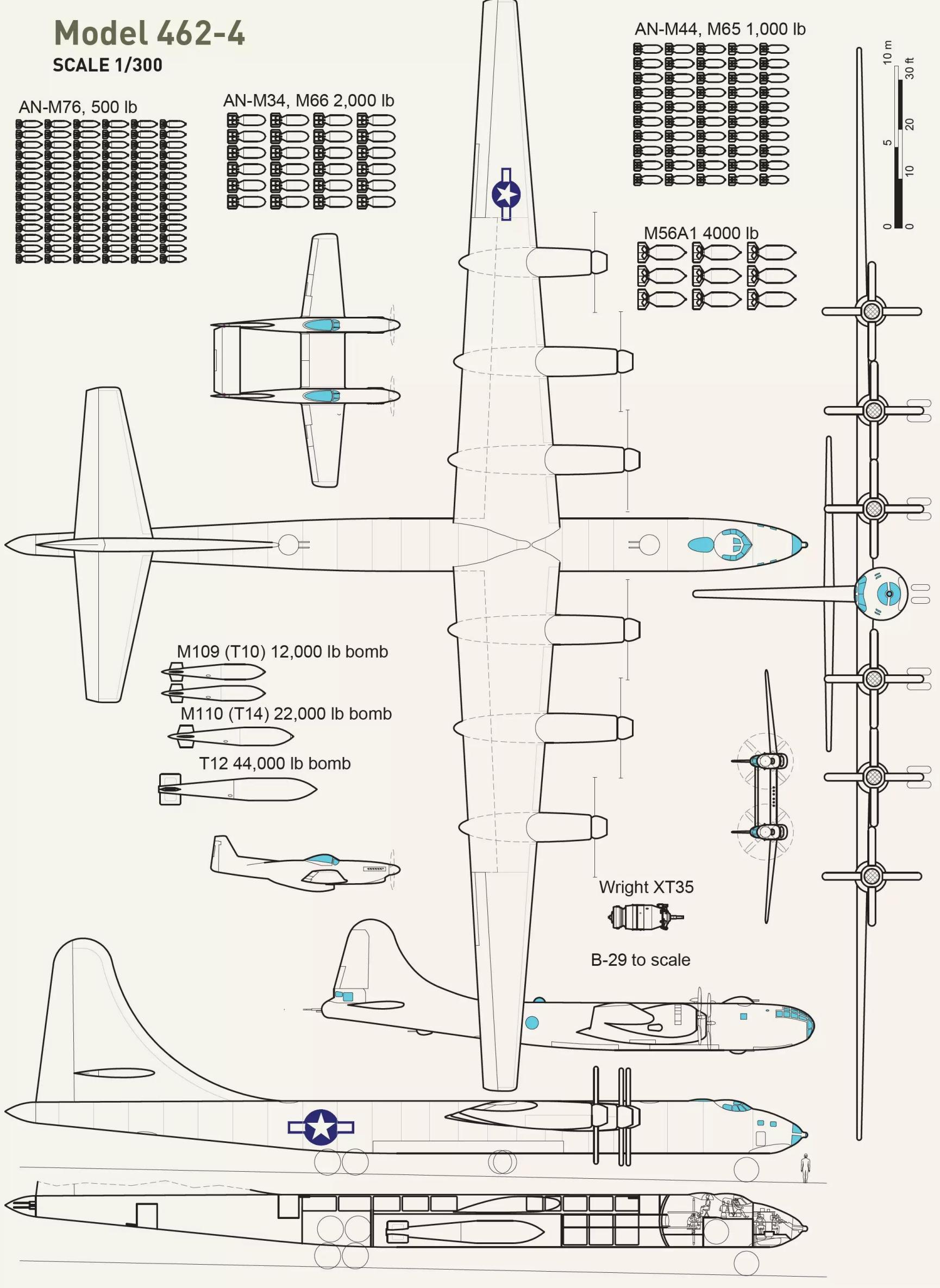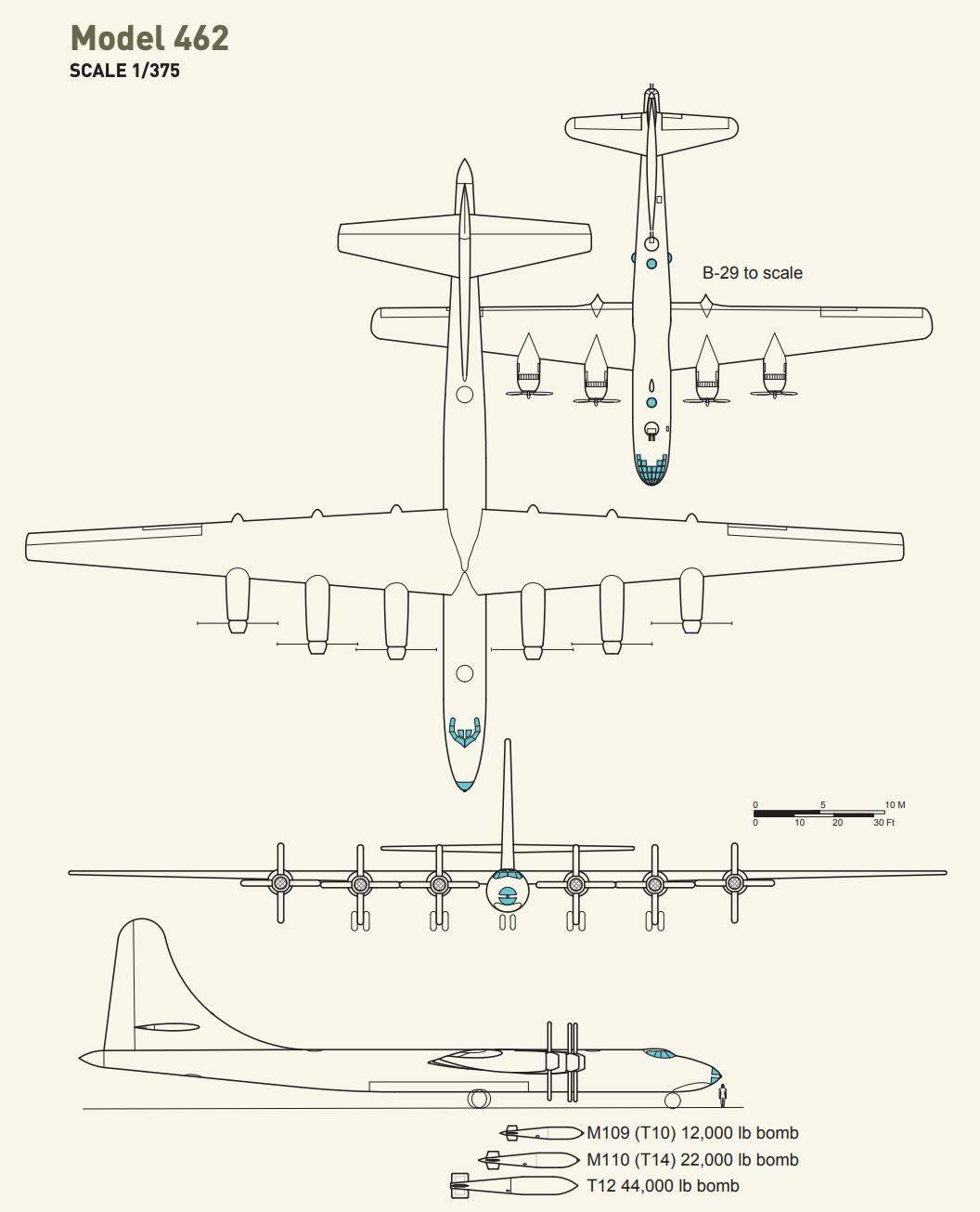 Model 462 与加大版 B-29 相似,拥有类似的轮廓和机翼形状。机头设有一个加压驾驶舱,可容纳 10 名机组成员。所有系统,包括防御武器,都通过乘员工作台远程遥控。