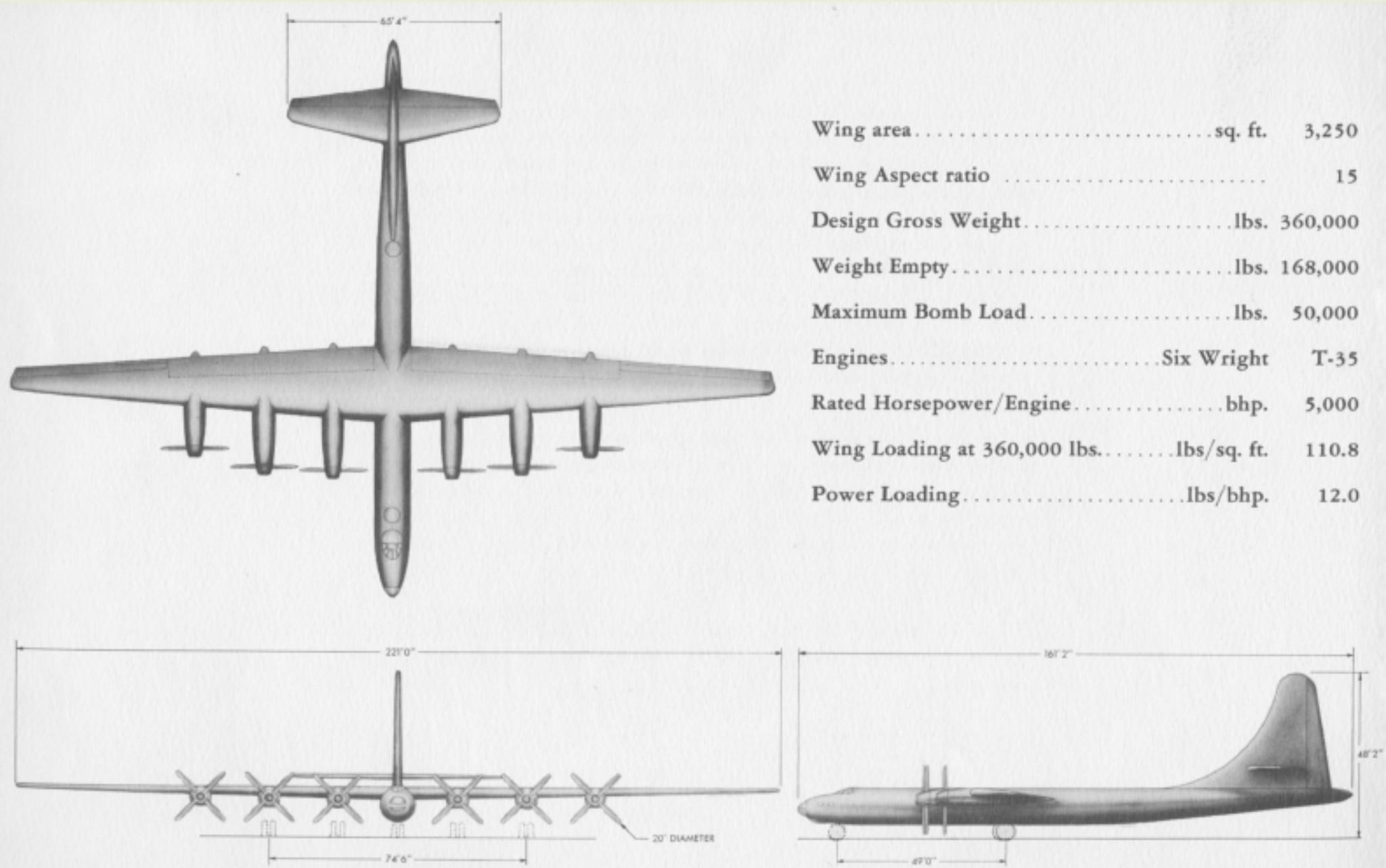 1945年秋,欧洲和太平洋的战场都已获得胜利。美国空军确定了远程重型轰炸机LRHBA的需求。考虑到防空系统和战斗机的快速发展,空军专家认为新型战略轰炸机必须具备极高的速度和高度,以降低被敌机摧毁的风险。最高速度至少达到725公里/小时,巡航速度约为560公里/小时。轰炸机升限应达到13,200米。巡航高度确定为10670米。最大载重设定为36吨。载重4.5吨时最大飞行距离为8000公里。