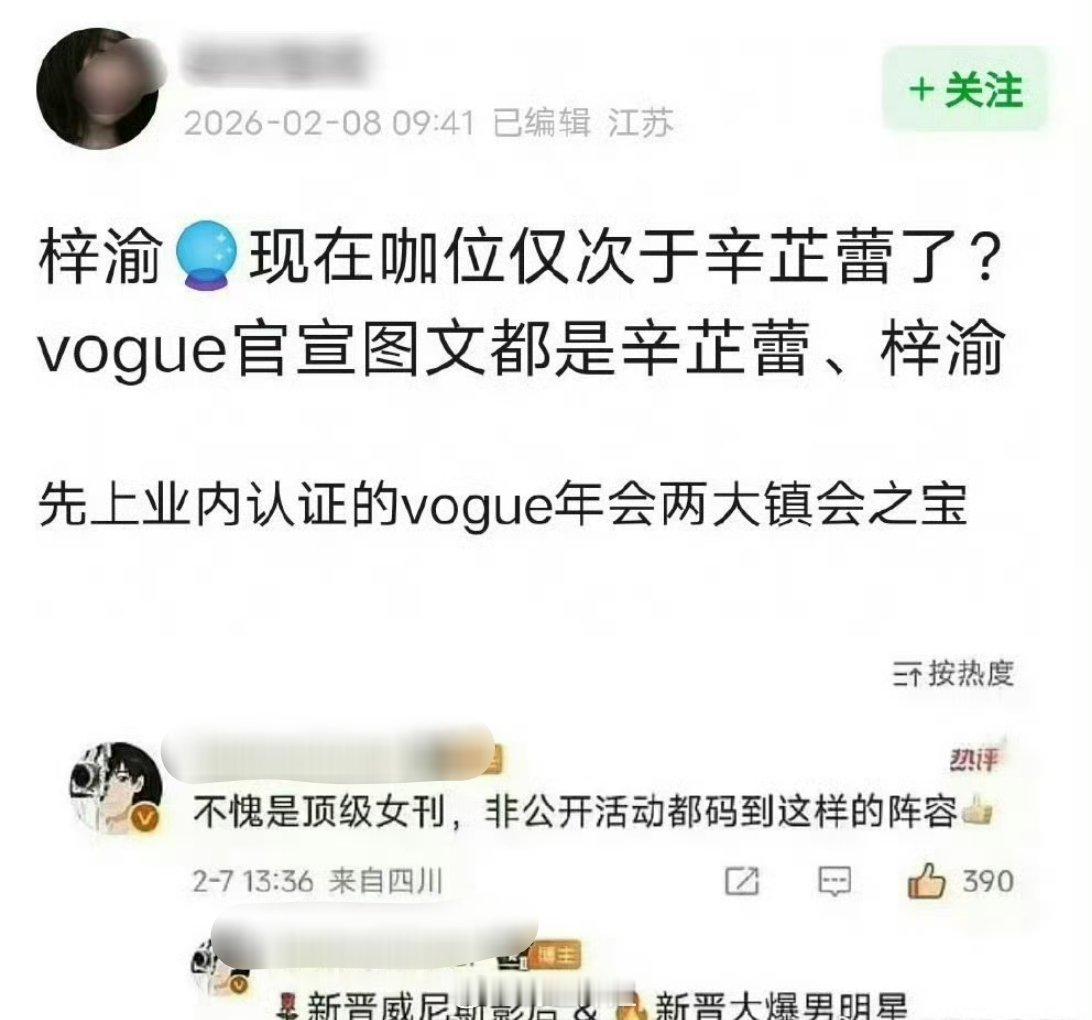 因为梓渝跟辛芷蕾一起出席了vogue年会,还同框了,就有网友问现在梓渝的咖位是不是仅次于辛芷蕾了?