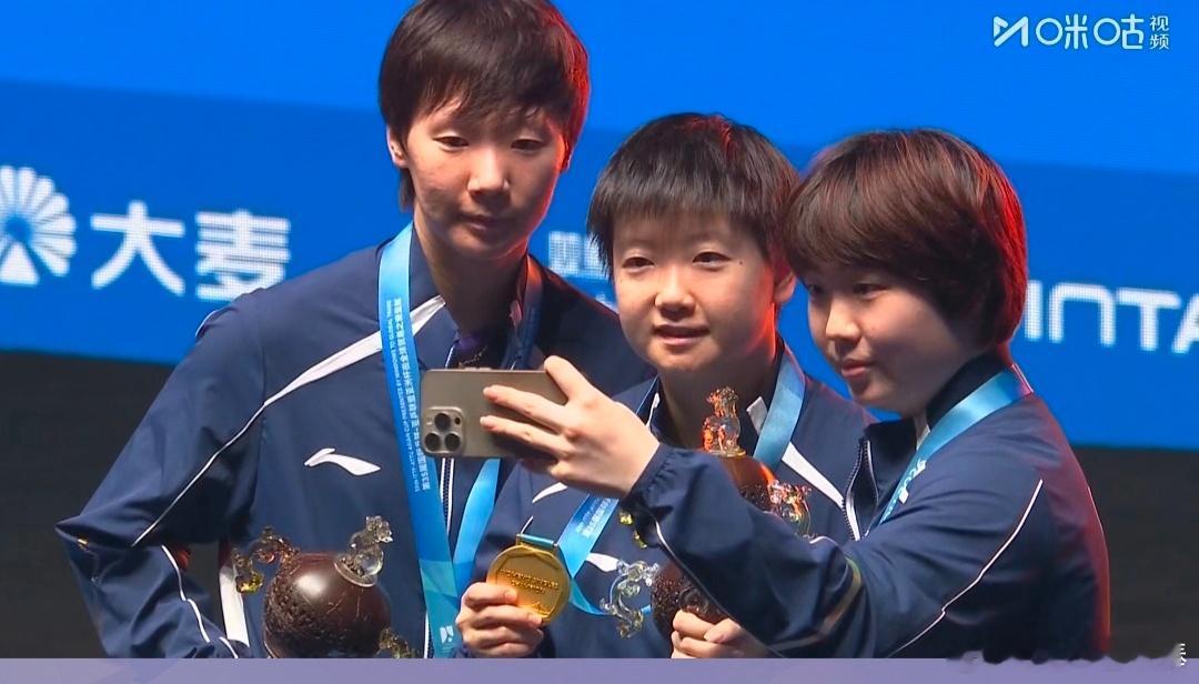 第35届国际乒联-亚乒联盟亚洲杯女单冠军孙颖莎,亚军王曼昱,第三名蒯曼。三面国旗同时升旗。都是好样的!辛苦啦!