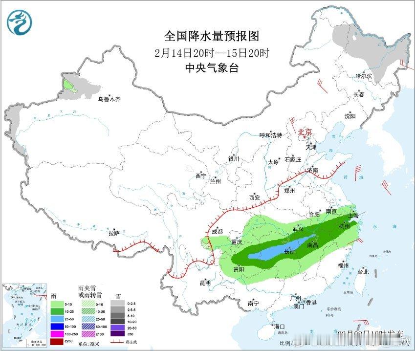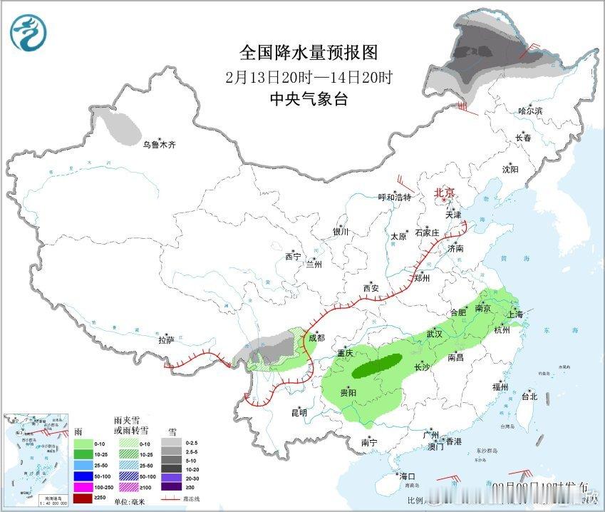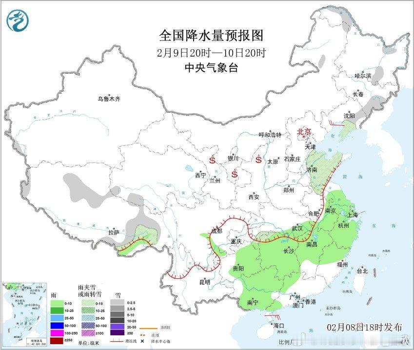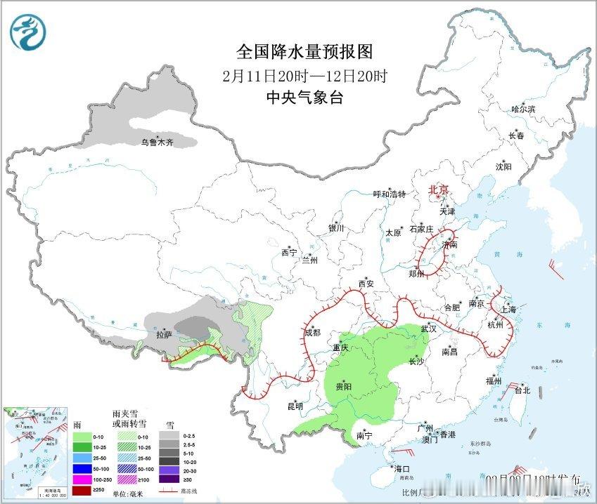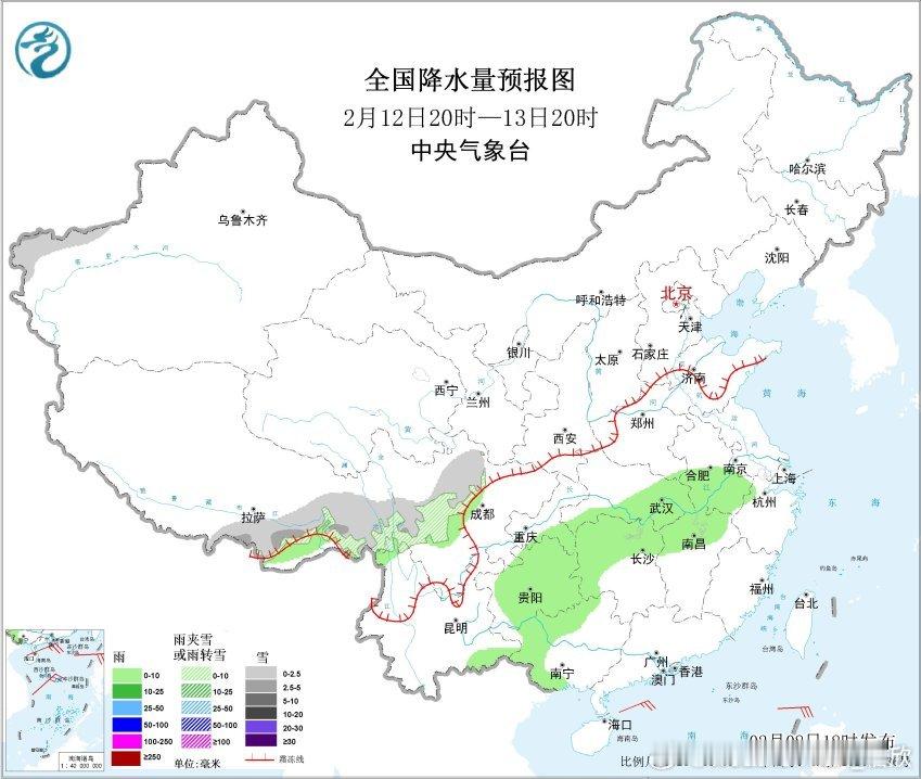 2月9日晚-10日,在江苏北部、山东、辽宁东部和吉林东部也可能出现雨夹雪或降雪。总体来看,本轮降水的冷暖空气都不是很强,因此雨雪强度相对较弱。本轮降水之后,11日降水暂时减少,向贵州湖南广西收缩。
