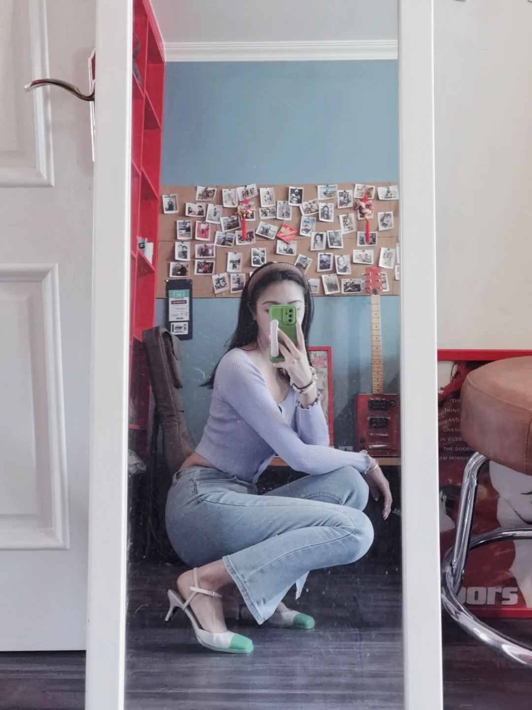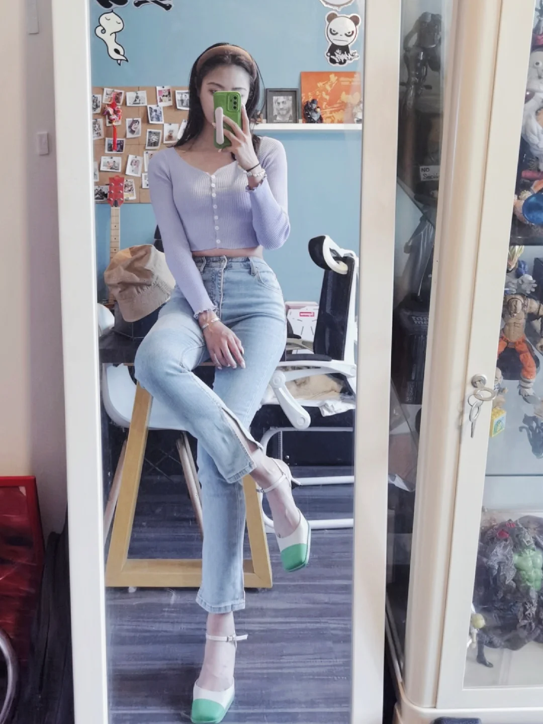浅蓝色针织短上衣配高腰牛仔裤,把纯欲风焊在身上! 上短下长显比例一绝,软fufu的针织衫又自带温柔滤镜,踩上拼色高跟鞋,甜度直接超标~