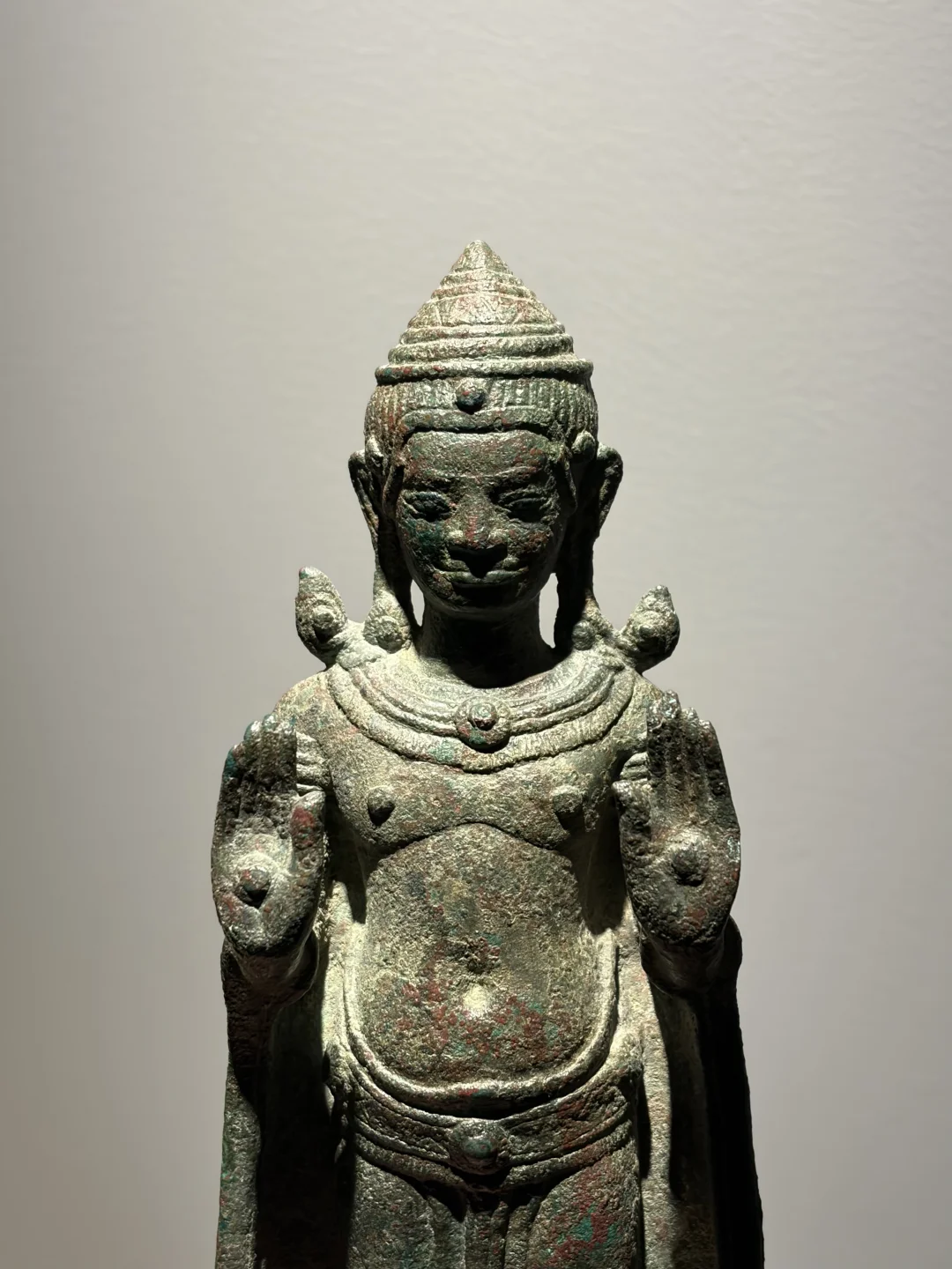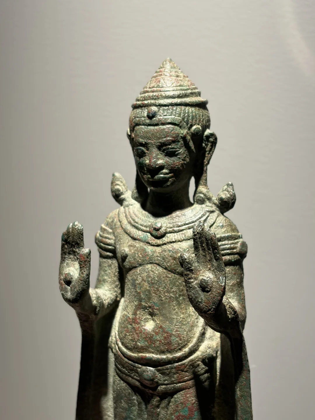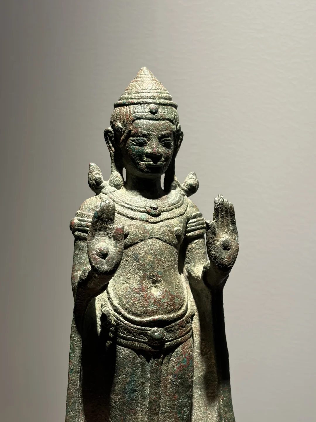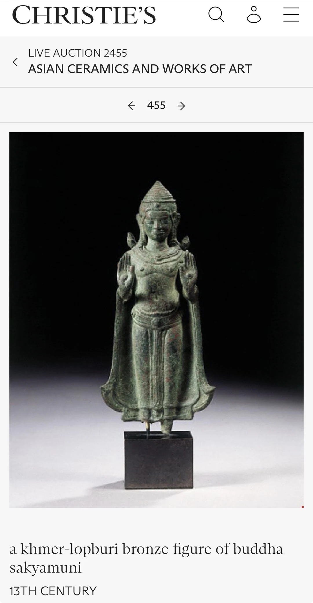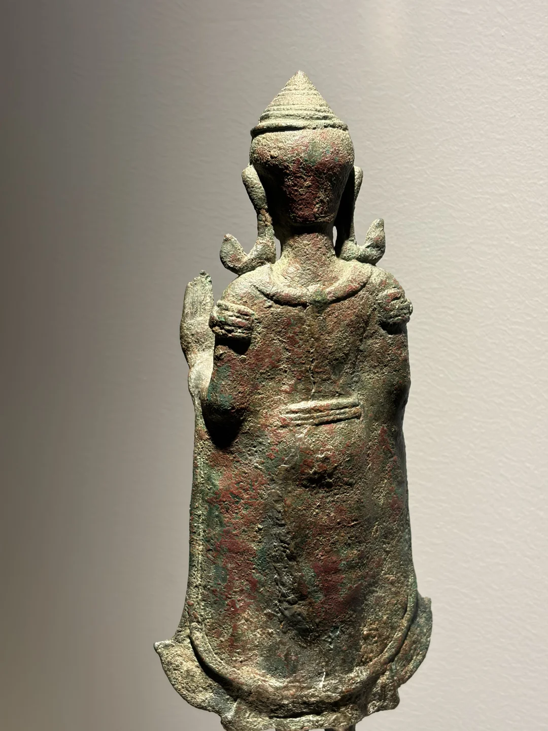 高棉13世纪 Lopburi华富里风格 青铜佛立像Buddha Sakyamuni 双手举起(abhayamudra),戴着僧衣(samghati)和珠宝,他脸上带着宁静的表情,宽阔的鼻子,丰满的嘴唇,戴着大耳环的长耳垂,圆锥形皇冠的条纹发型,绿色铜绿。 净高:25cm 来源:佳士得CHRISTIE'S 2000年阿姆斯特丹Asian Ceramics and Works of Art专场 N455 上一任泰国藏家用于供奉所以修复了双脚,背部有补。