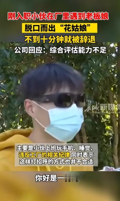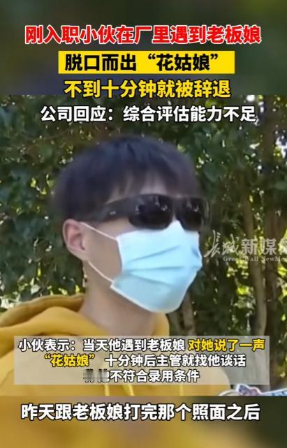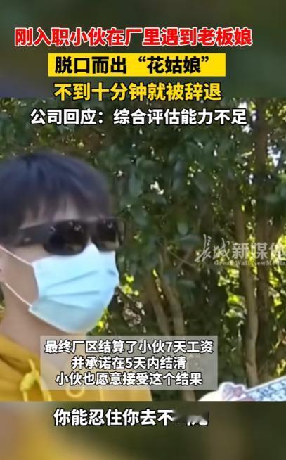 这就是嘴欠的后果。2023年,浙江湖州,20岁小伙去厂里上班,瞎逛时,碰到一位气质出众的漂亮女子,小伙忍不住喊了一句花姑娘,万万没想到,十分钟后,他就被解雇。 职场里的一句无心之言,有时会换来始料未及的结果,浙江湖州一位 20 岁的小伙就因为随口的一个称呼,刚入职没几天就丢了工作。 小伙通过面试,入职了一家工厂,事发当天,正是小伙真式跟岗学习的第七天,还未独立开展巡检工作。 小伙年纪轻,刚踏入职场,对工厂的工作节奏和规章制度还处在适应阶段,他的带教师傅是在厂里干了 8 年的老巡检员,据师傅说,小伙平日里学东西不算快,但也还算听话,只是偶尔会在工作间隙有点心不在焉。 事发当天中午,工厂的午休时段还没结束,小伙和工友们在厂区食堂吃完统一的工作餐后,独自走到二楼楼道闲逛,想着趁这会功夫抽支烟再回车间。 厂区里随处可见穿着蓝色工装、身上沾着木屑的工人,机器的轰鸣声虽在午休时停歇,但四处还是透着工业生产的忙碌气息,就在小伙掏出烟刚准备点燃的瞬间,迎面走来了一位三十多岁的女性。 这位女子妆容清爽利落,周身的气质和厂区里的环境格格不入,一眼看过去就不是普通的车间工人,小伙当下眼睛一亮,完全没经过大脑思考,张口就冲着对方喊了一声 “花姑娘”。 喊完之后他还觉得自己是在夸赞对方长得好看,像花儿一样亮眼,压根没意识到这个称呼本身的不妥,更没琢磨过对方的身份。 听到这声称呼后,这位女子脚步当即停住,目光冷冷地扫了一眼小伙胸前的工牌,工牌上清晰印着他的姓名、入职工号以及所属岗位。 女子全程没说一个字,就只是看了小伙短短五六秒,随后便转身径直离开,而小伙也没把这个小插曲放在心上,依旧在楼道处抽着烟,全然没料到麻烦已经找上门。 距离喊出那声 “花姑娘” 还不到十分钟,小伙的手机突然响起,来电显示是工厂人事科的办公电话。 接起电话后,人事科的工作人员直接告知小伙,公司经综合评估后,决定解除和他的劳动合同,下午不用再来厂区上班,让他尽快到人事科办理离职手续。 这个消息如同晴天霹雳,让小伙瞬间愣在原地,他反复在电话里追问辞退的原因,自己刚进厂没几天,没犯什么大错,怎么突然就被开除了。 可人事科工作人员只表示这是公司的正式决定,具体缘由可以去咨询直属车间主管。 挂了电话的小伙又急又懵,一路小跑回到车间找到主管,一番追问后才得知,刚才被他喊 “花姑娘” 的那位女子,正是这家家具厂的老板娘。 小伙当下懊悔不已,连忙跟主管解释,自己根本不知道对方的身份,喊那声话纯粹是无心之失,只是觉得对方气质好、长得好看,没有任何不尊重的意思。 他始终觉得,公司就是因为自己这句无心的称呼,才执意要辞退自己。 小伙坦言,自己入职的这几天里,确实有两次在工作间隙拿出手机刷了几秒,每次都不超过 5 分钟。 被主管口头提醒过一次后就立刻改正了,从来没有在工作岗位上睡过觉,实在想不通为何会被突然辞退。 为了讨要一个明确的说法,小伙联系了当地的民生媒体,希望记者能陪同自己前往工厂进行交涉。 记者随同小伙来到该家具厂后,工厂的负责人汪经理出面进行了正式回应,他明确表示,小伙被辞退这件事,和老板娘没有任何关联。 并非因为那句不当称呼,而是公司根据试用期考核标准,对其进行全方位综合评估后,认定其无法胜任车间质量巡检员的岗位,才依法解除了劳动合同。 汪经理还拿出了小伙 7 天试用期内的考核记录,上面清晰记录着:小伙在跟岗学习期间,巡检实操的现场考核得分仅 52 分,未达到岗位要求的 70 分合格线。 汪经理还表示,即便小伙喊的不是老板娘,只是厂里的普通女员工,“花姑娘” 这个称呼也存在明显的不尊重,作为职场人,基本的言行分寸和对他人的尊重是必备的职业素养。 关于小伙最关心的工资结算问题,汪经理也给出了明确答复,会将其 7 天工作的工资在 3 个工作日内足额发放至其银行卡中,不会有任何拖欠和克扣。 最后在记者的协调下,小伙也接受了公司的处理决定,双方达成了和解,小伙表示自己已经深刻意识到了自己的问题。 以后再找工作,一定会注意自己的言行举止,也会踏踏实实认真对待工作,不再犯这样的错误。 这件事被媒体发布到网上后,也引发了不少网友的关注和讨论,有人觉得小伙确实做事欠考虑,不了解词汇的含义就随便说,也有人对公司的处理方式有不同的看法。 企业对于试用期员工的考核正变得越来越规范和严格,而职场新人更需要从入职之初就端正工作态度,遵守职场规则,提升自身的岗位能力,不管是说话还是做事,都要多一份思考,多一份谨慎。 对于这件事,您有什么想说的吗?欢迎评论区留言讨论。 信源:长城新媒体2023-11-26——《11月24日报道 浙江 刚入职小伙在厂里遇到老板娘脱口而出“花姑娘”,不到十分钟就被辞退。》