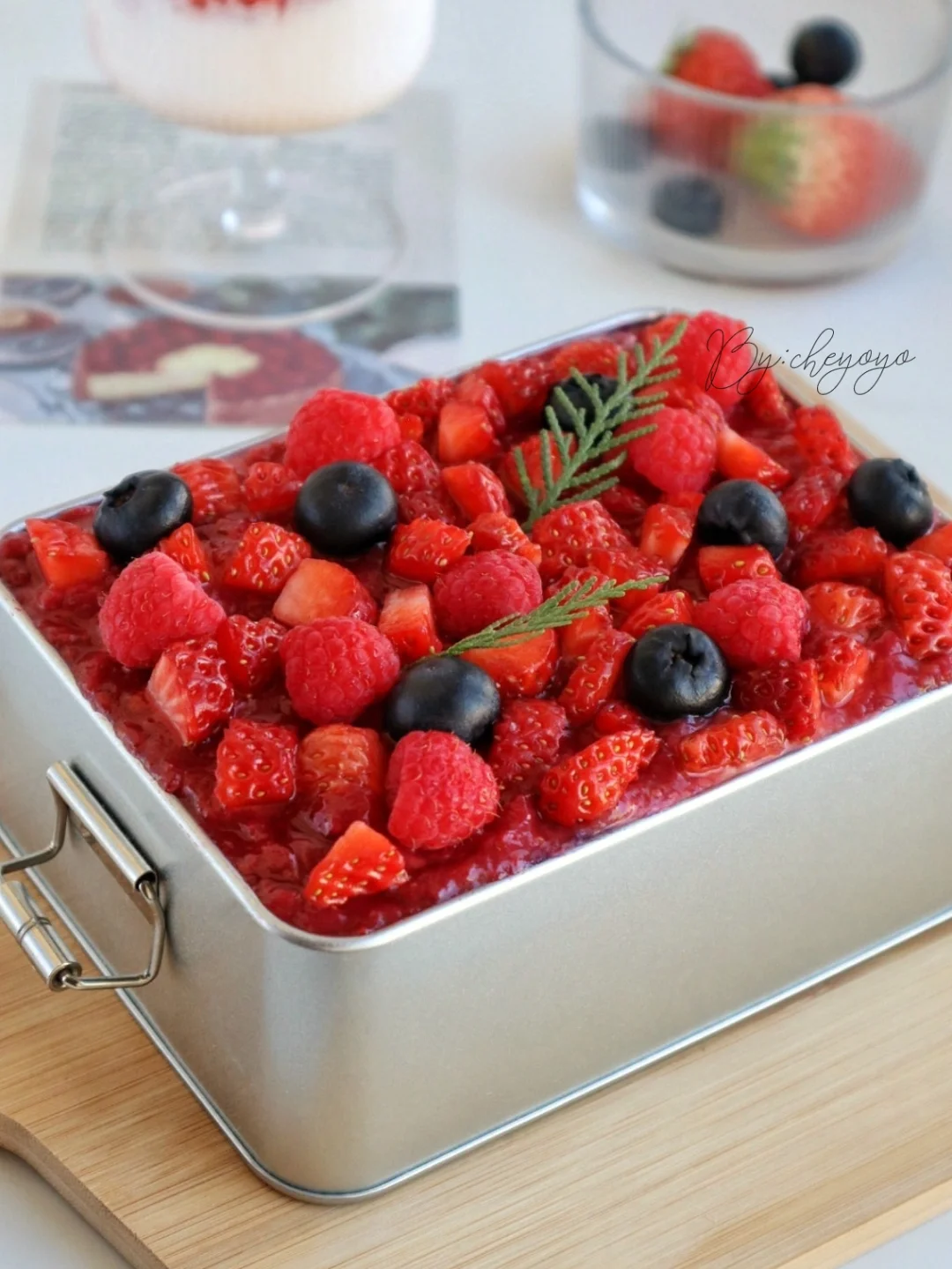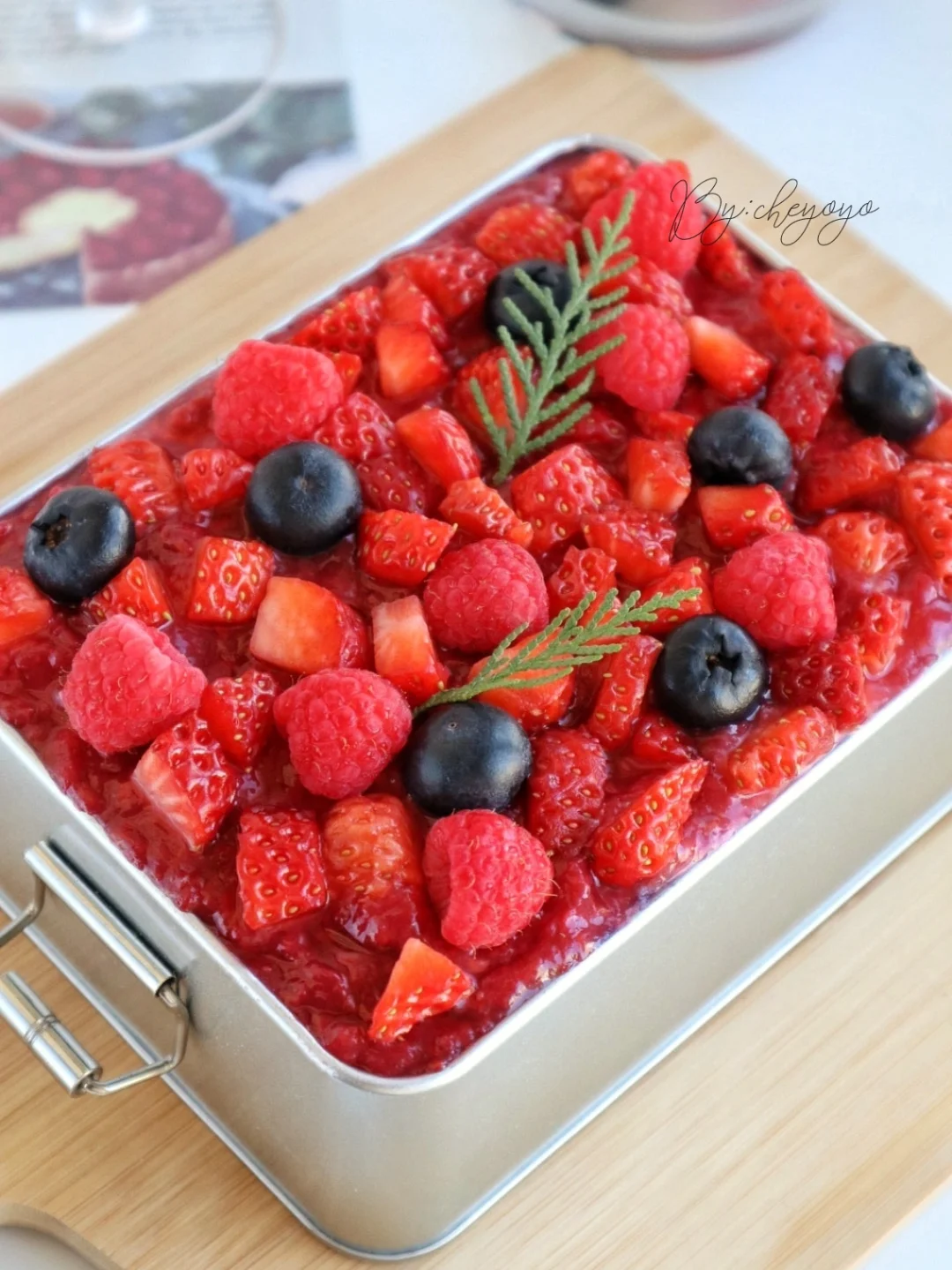 6️⃣ 表面抹一层树莓果酱,摆满新鲜莓果,颜值拉满😋😋