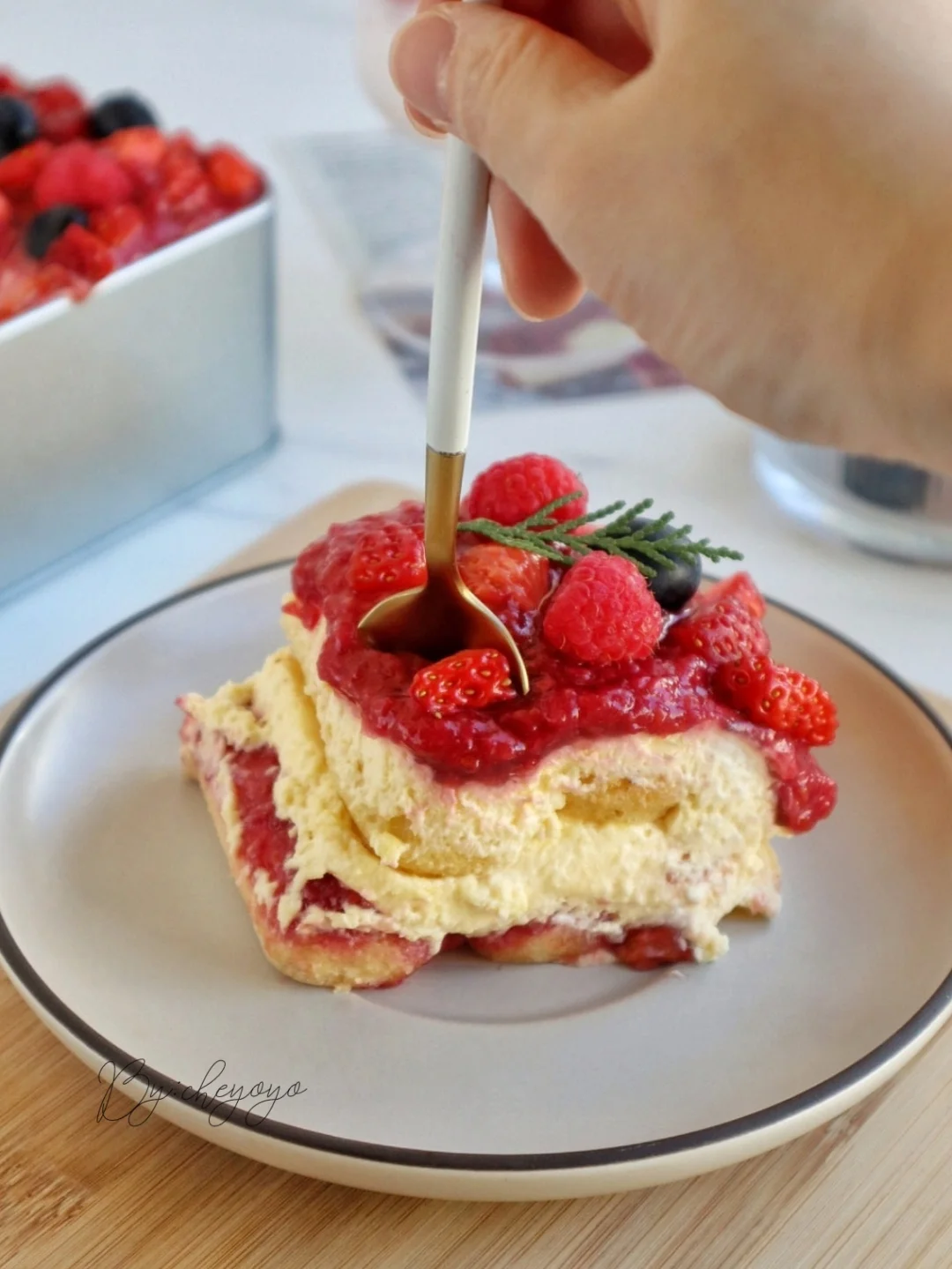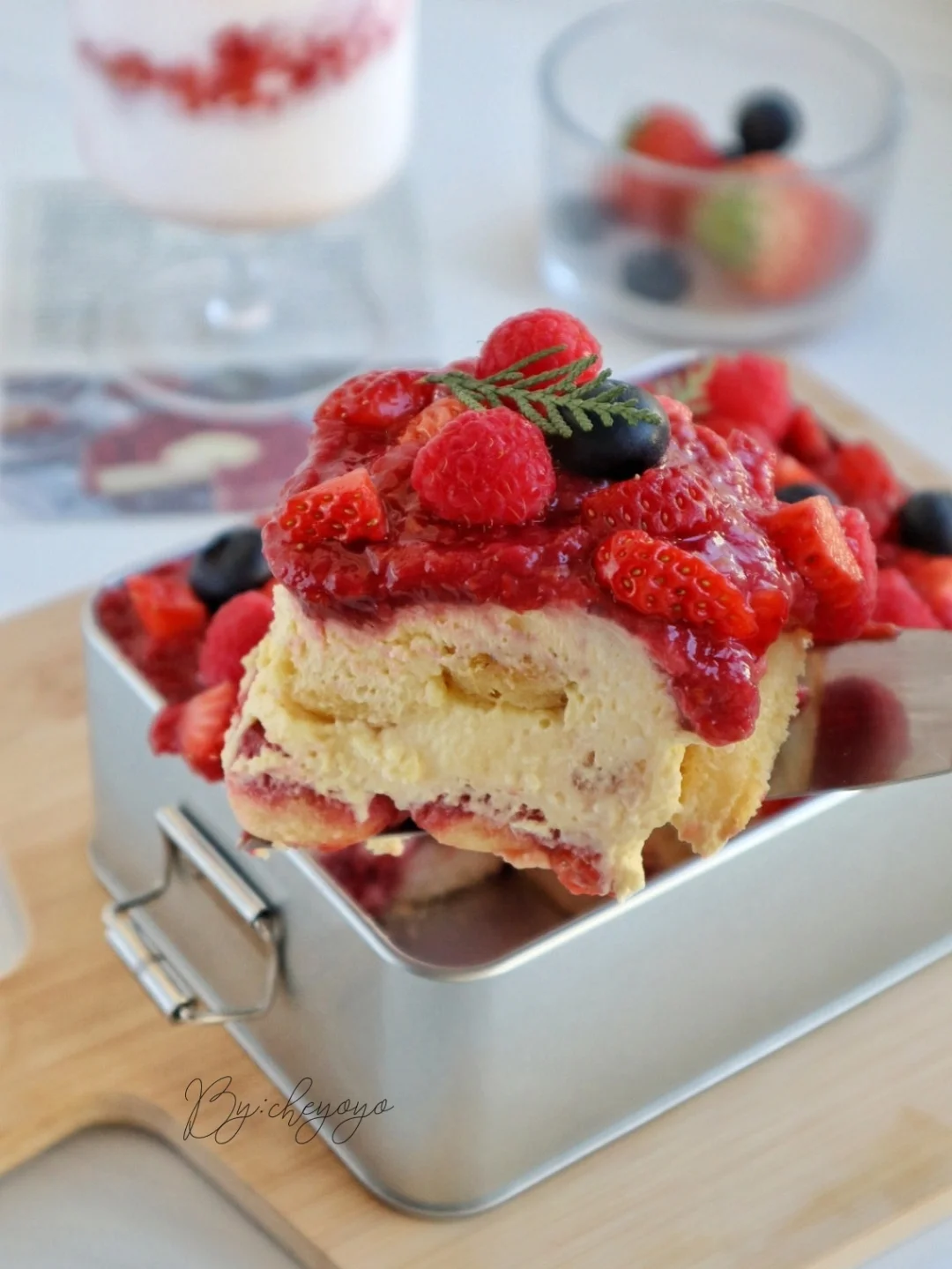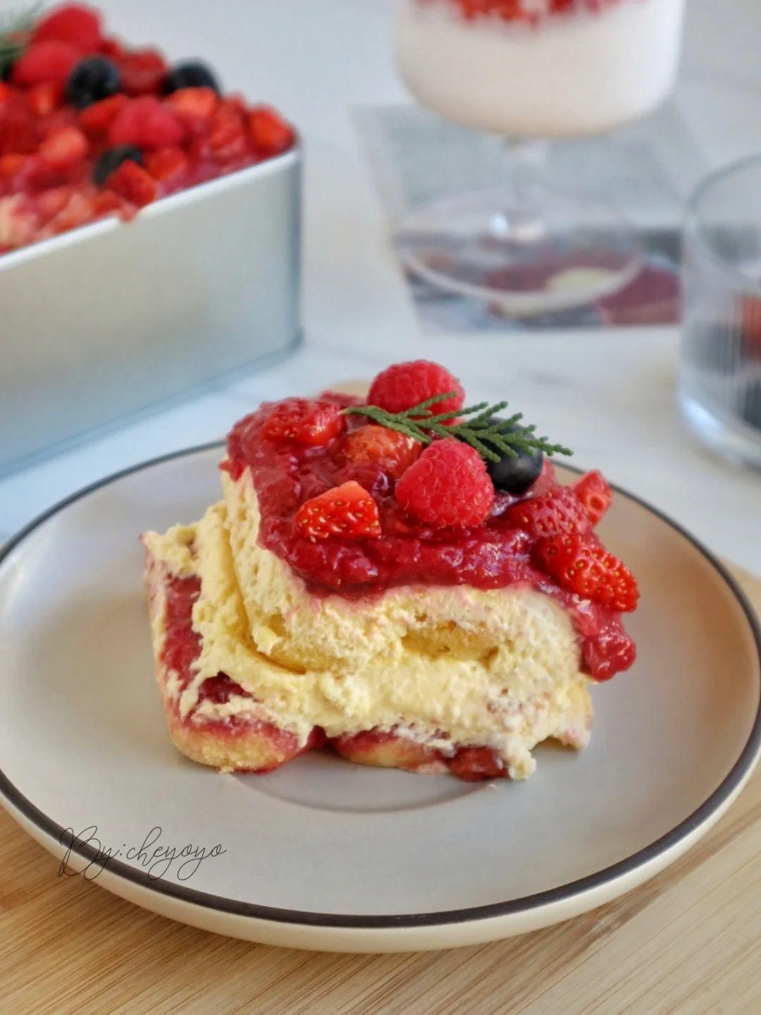 过年一定要做这款莓果提拉米苏,不仅颜值在线,而且做法简单,超适合手残党和没有烤箱的宝子们😘😘酸甜的树莓果酱中和了马斯卡彭的醇厚,吃起来一点都不腻,冷藏后冰冰凉凉的,新年吃超合适~😍