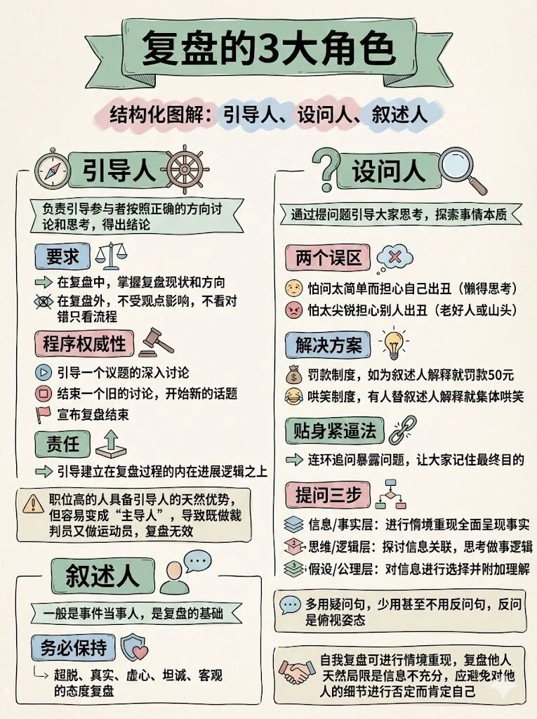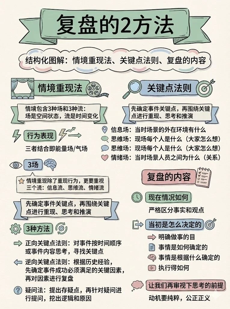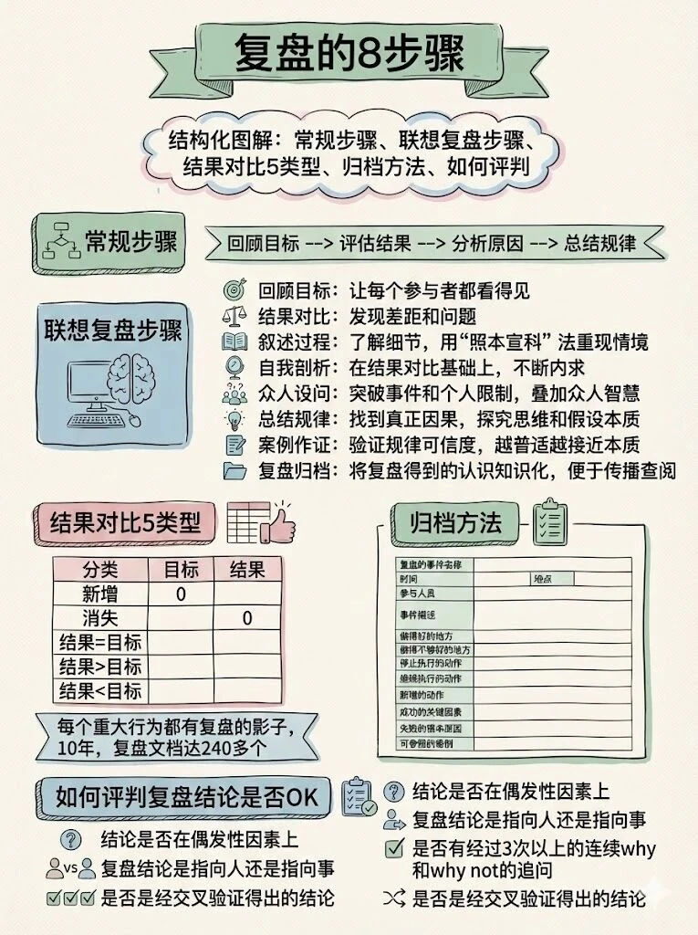 回顾目标→评估结果→叙述过程→自我剖析→众人设问→总结规律→案例作证→复盘归档