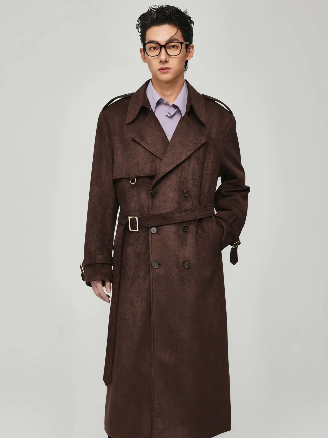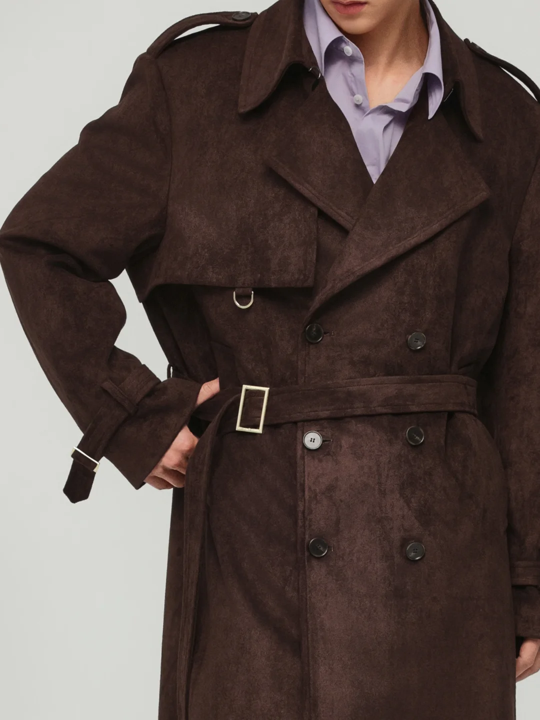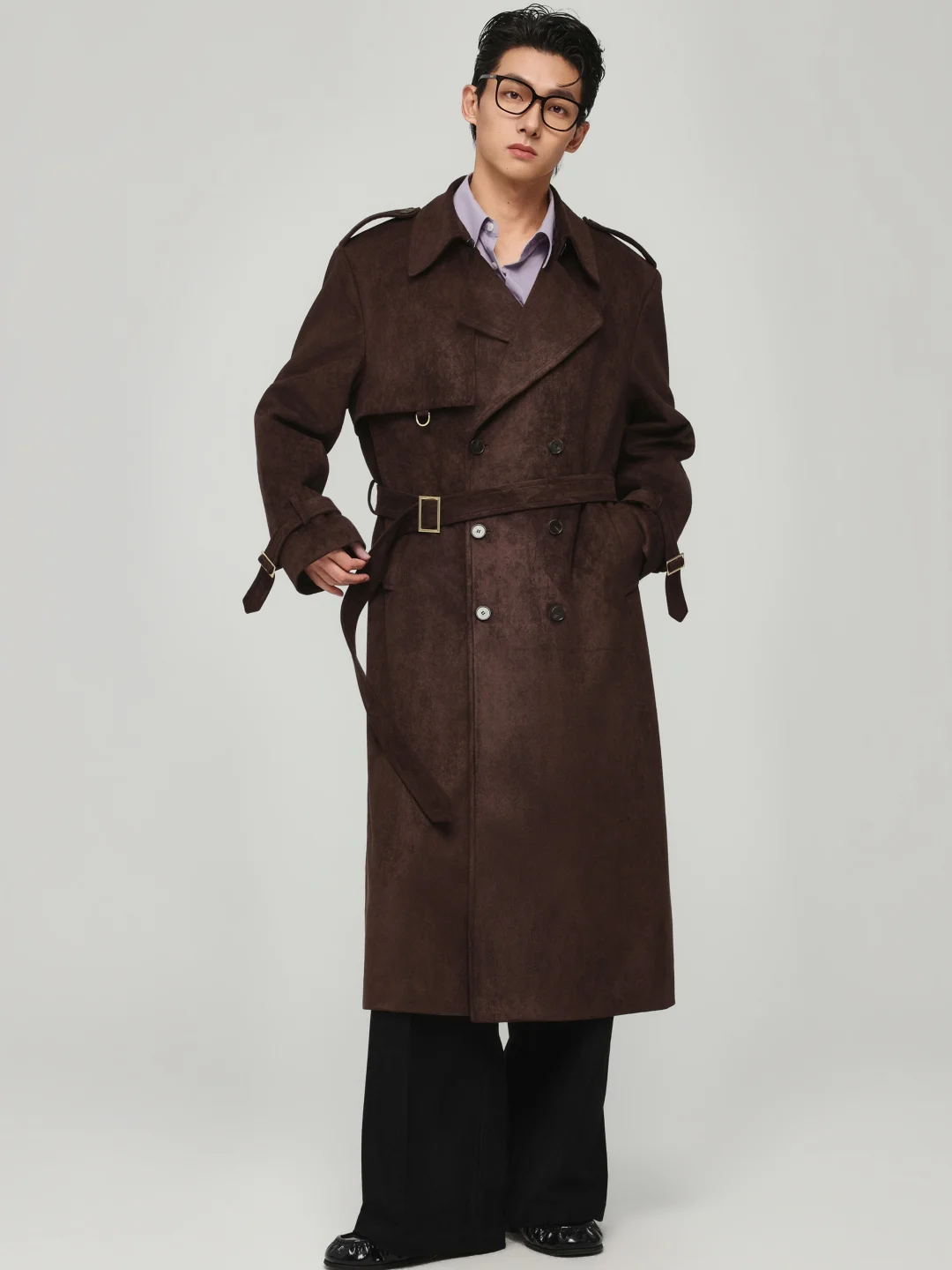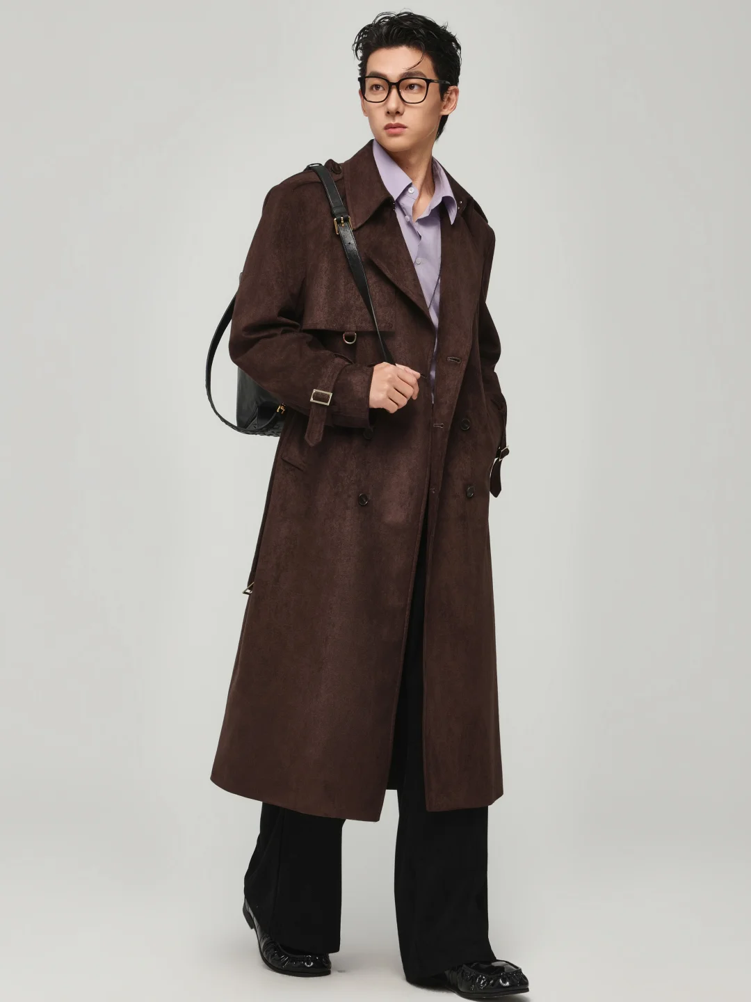 比起规规矩矩的衬衫,我更喜欢在里面叠穿一件浅紫色的内搭。这种浓郁咖+冷调的撞色,真的很有那种不随大流的审美