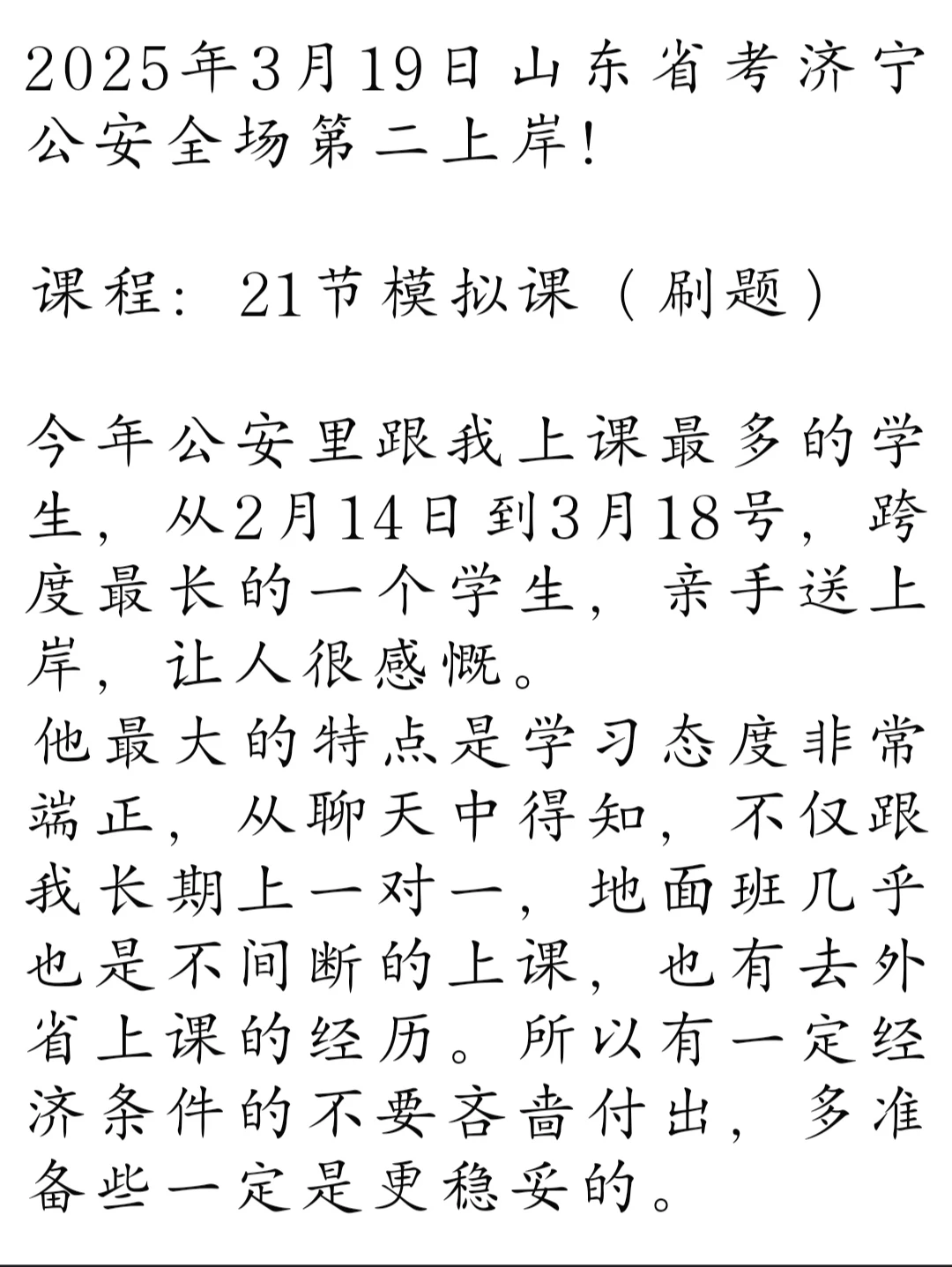 今年公安里跟我上课最多的学生,从2月14日到3月18号,跨度最长的一个学生,亲手送上岸,让人很感慨。
