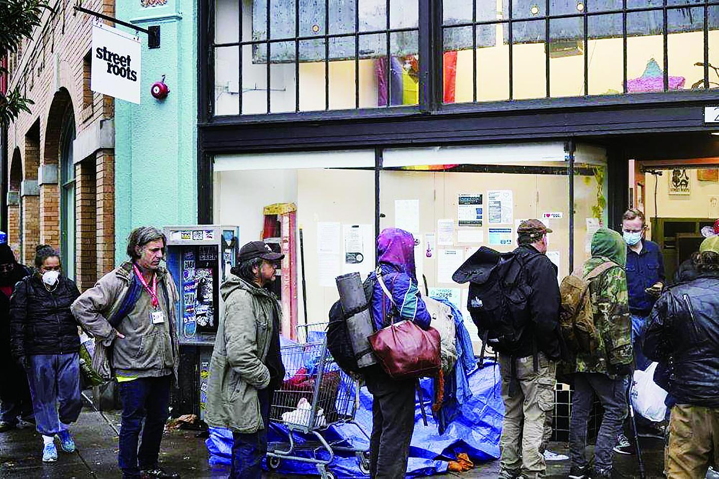 无家可归者排队等待从民间组织领取救助物品新华社发