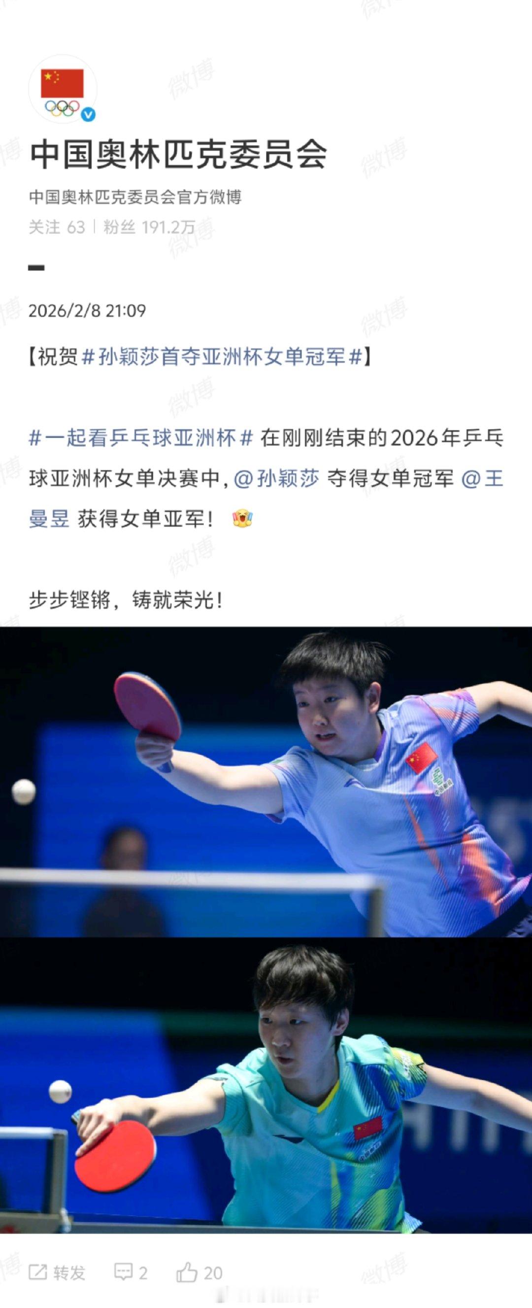 【奥委会祝贺孙颖莎首夺亚洲杯女单冠军】奥委会祝贺孙颖莎亚洲杯女单冠军