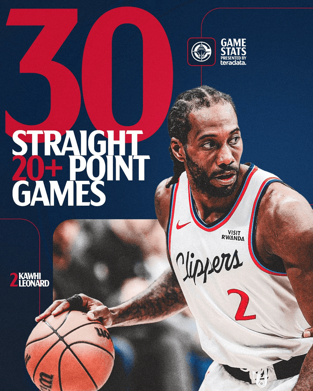 快船官方晒海报:伦纳德已经连续30场得分砍下20+。