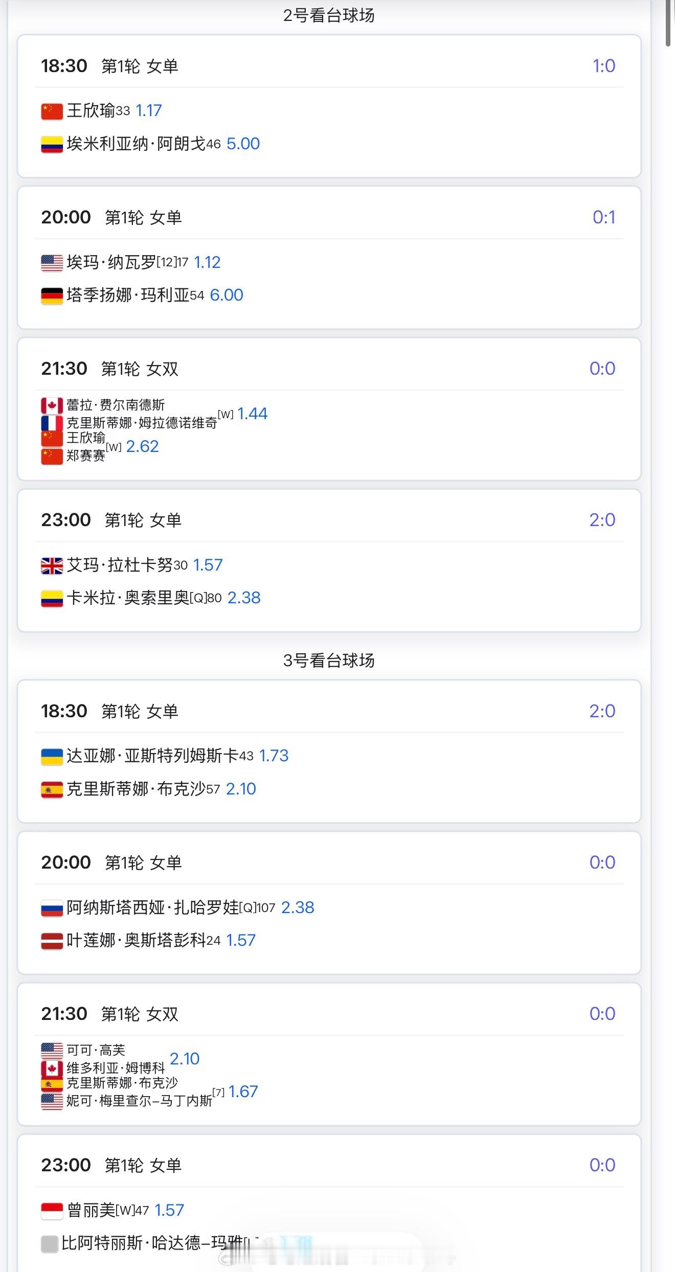 18:30 王欣瑜 vs阿朗戈20:00 埃拉 vs 瓦伦托娃21:30 郑钦文vs肯宁