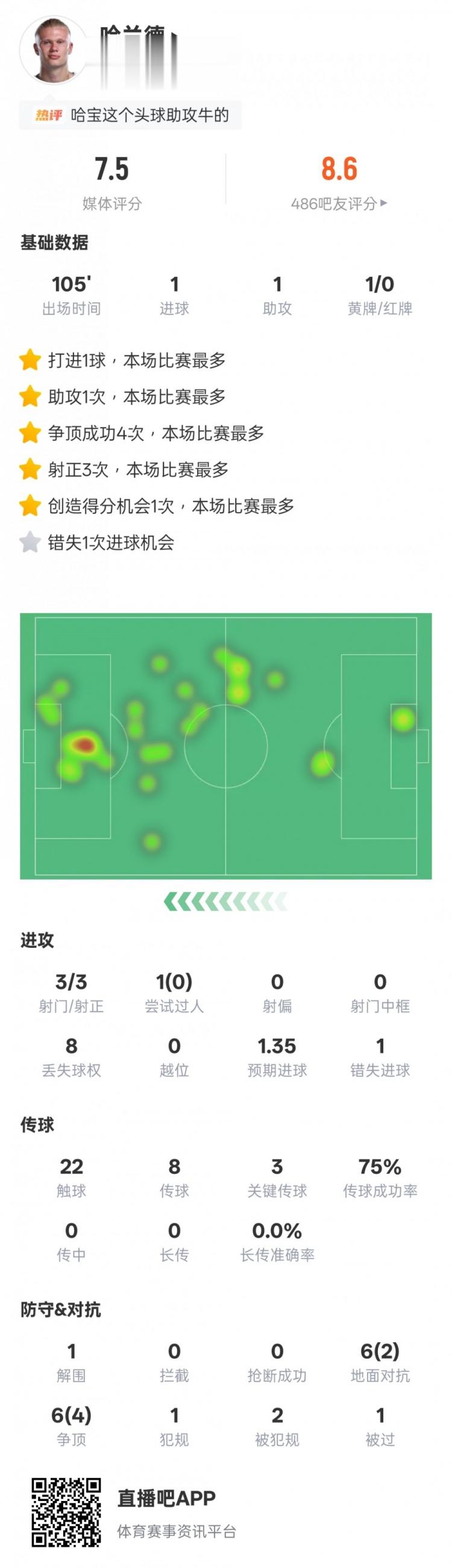 哈兰德本场比赛数据如下: