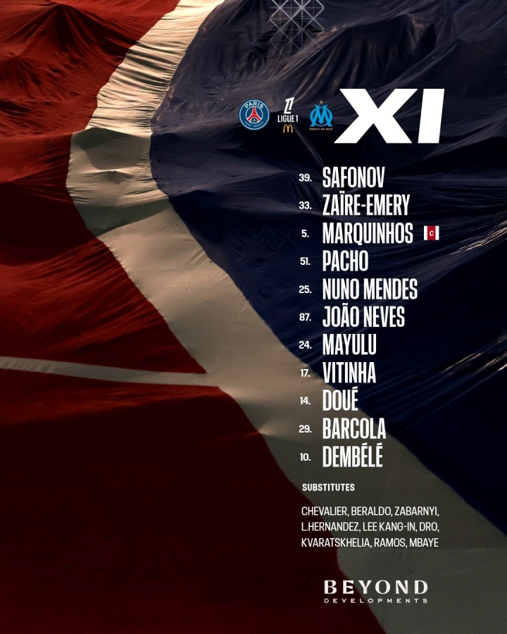 39-萨福诺夫、33-扎伊尔·埃梅里、5-马尔基尼奥斯、51-帕乔、25-努诺·门德斯、87-若昂·内维斯、24-马尤卢、17-维蒂尼亚、14-杜埃、29-巴尔科拉、10-登贝莱