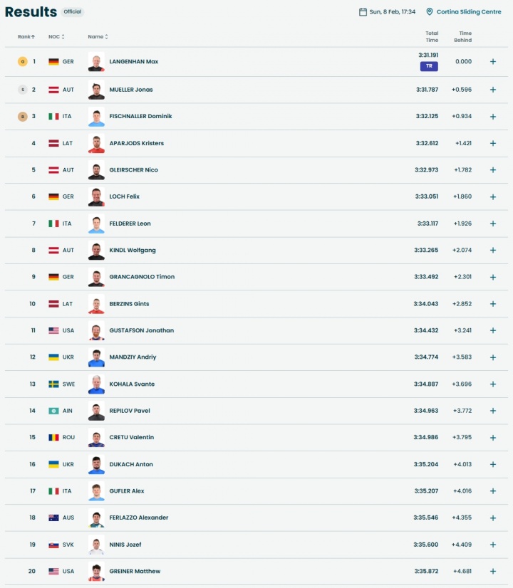 直播吧02月09日讯米兰冬奥会男子单人雪橇金牌产生,经过4轮滑行的激烈角逐,世锦赛冠军、德国选手马克斯・朗根汉斩获金牌。他在滑行中跑出131.1公里的最高时速,同时刷新该项目赛道纪录。