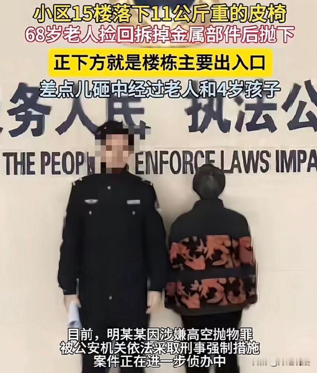 湖北黄石。某小区一栋楼门口突然巨响,一把11公斤重的黑色大皮椅从15楼砸下,摔得七零八落。就在椅子落地前几秒,一位老人带着4岁孩子刚好走过,离砸落处不到3米,差点丧命。警方调监控发现椅子是被人从15楼窗户扔下,排查后锁定14楼68岁的明某某。她因懒得搬椅子下楼,观察楼下没人后便扔了,民警找上门时她还满不在乎。 1月31日下午,一栋楼的门口,突然“轰”的一声,惊得周围人纷纷探出头来。 只见一把黑色大皮椅,重重地砸在地上,摔得七零八落,零件散落得到处都是,这皮椅可不轻,足有11公斤重。 巧的是,就在椅子落地前几秒,一位老人正带着4岁的孩子,慢悠悠地从楼下走过,那椅子砸落的地方,离他们不到3米远,要是再偏一点,这一老一少,恐怕就没命了。 调取监控后,发现这把椅子竟是被人从15楼的窗户扔下来的。这得是多大的胆子,才能干出这种事! 经过一番排查,民警锁定了嫌疑人,14楼68岁的明某某。 这明某某,平时就爱捡废品。 案发前一天,她不知从哪儿捡了把皮椅,随手就放在了15楼的楼道里。 第二天,她琢磨着把椅子拆了,把金属部分拿去卖钱。 拆完金属部分后,剩下这沉重的皮椅,可把她愁坏了,她实在懒得搬下楼去,心里就打起了坏主意。 下午的时候,她站在15楼的消防通道窗口,探出头去,观察着楼下的情况,见楼下没人,她心里一横,就把这11公斤重的皮椅,从窗户扔了出去。 她以为,自己做得神不知鬼不觉,没人会发现,可她没想到,监控把这一切都拍了下来。 就在她扔下椅子没多久,警方就找上了门,面对警方的询问,明某某一开始还装糊涂,不肯承认。 可当警方拿出监控视频,摆在她面前时,她才没了话说。 不过,即便如此,她还是满不在乎,觉得这没什么大不了的。 她不知道,自己的这一行为,差点害了两条人命。那老人和孩子,要是真出了事,她能承担得起这个责任吗? 周围的人知道这件事后,都气愤不已。纷纷指责明某某太自私、太懒惰,为了省点搬椅子的力气,就不顾他人的安危。 “这老太太,也太没公德心了,怎么能干出这种事呢!”邻居王大爷气得直跺脚。 “就是啊,要是真砸到人了,那可怎么办啊!”李阿姨也附和道。 大家你一言我一语,都在谴责明某某的行为。 而明某某却还是一副无所谓的样子,好像这件事跟她没关系似的。 明某某的行为,已触犯刑法中高空抛物罪。 根据刑法第二百九十一条之二规定,从建筑物抛掷物品,情节严重的,处一年以下有期徒刑、拘役或者管制,并处或者单处罚金。 11公斤的皮椅从15楼抛下,重量与高度结合足以危及公共安全,且砸落点距行人不足3米,虽未造成实际伤亡,但已构成“情节严重”标准。 从主观层面看,明某某明知楼下可能有人通行,仍为图方便故意抛掷,存在直接故意心态。 即便她辩称“观察无人”,但高空抛物罪不要求实际发生损害结果,只要行为本身具有现实危险性即可入罪。 此外,若能证明该行为对特定人造成精神损害,受害人还可依据民法典第1183条主张精神损害赔偿。 值得注意的是,若皮椅砸中行人导致重伤或死亡,明某某可能面临更重的过失致人重伤罪或过失致人死亡罪。 此事,也暴露出小区管理漏洞,物业若未及时清理楼道杂物,可能需承担相应民事责任。 民警可不会惯着她这毛病,经过调查取证,最终,明某某因涉嫌高空抛物,被公安机关依法采取了措施。 直到这时,明某某才意识到事情的严重性,开始后悔自己的所作所为。 可后悔有什么用呢?事情已经发生了,造成的后果也无法挽回。 高空抛物,看似是一件小事,可却隐藏着巨大的危险,一个不小心,就可能酿成大祸。 明某某为了省点力气,就做出这种危险的行为,差点害了一老一少两条命,她这种自私、懒惰的行为,实在是让人气愤。 您觉得对这类高空抛物行为,除刑罚外是否该引入信用惩戒机制?您对这件事有什么看法呢?