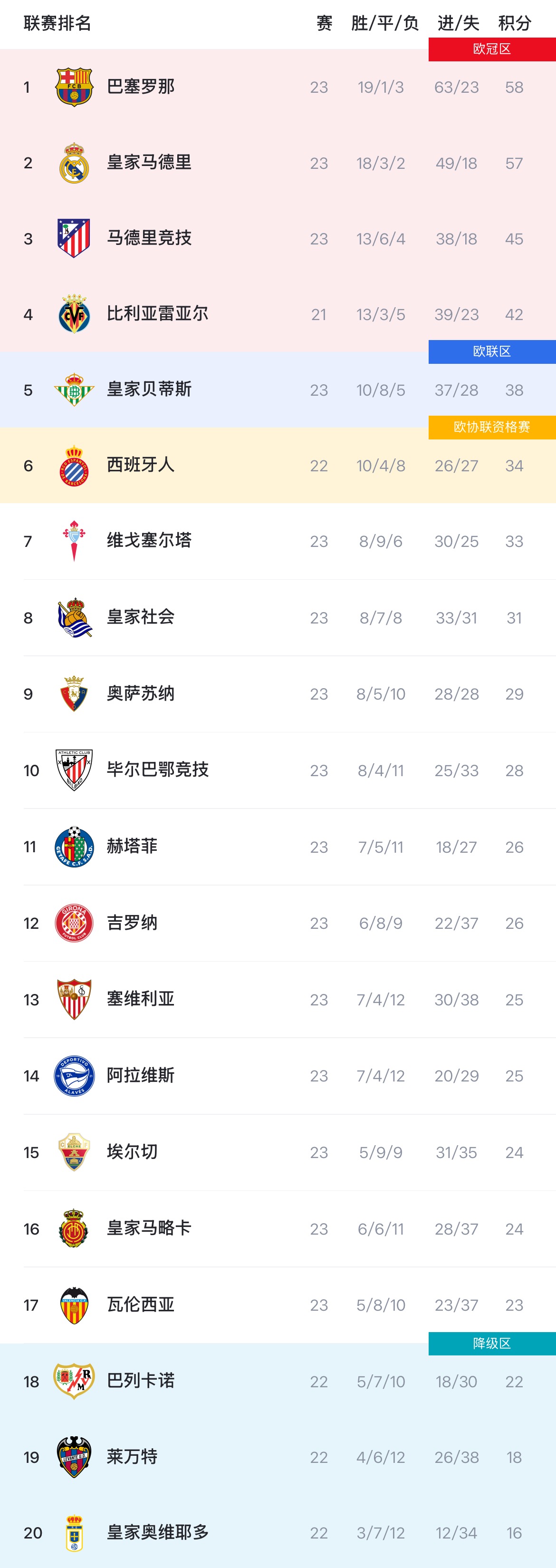 虎扑02月09日讯西甲第23轮部分场次战罢,积分榜头部依旧胶着:巴萨23轮58分继续领跑,皇马客场2-0瓦伦西亚后以57分紧追其后,榜首差距仍为1分。