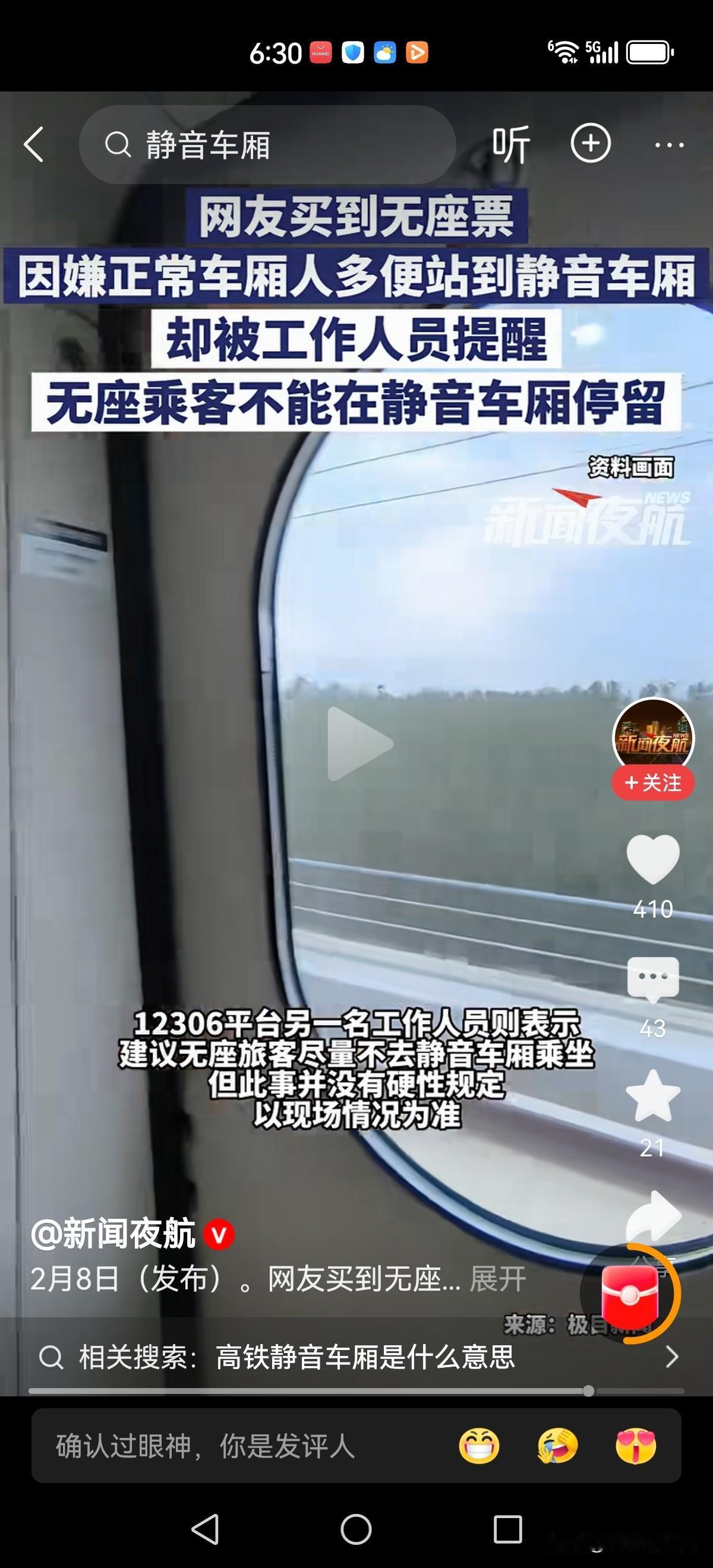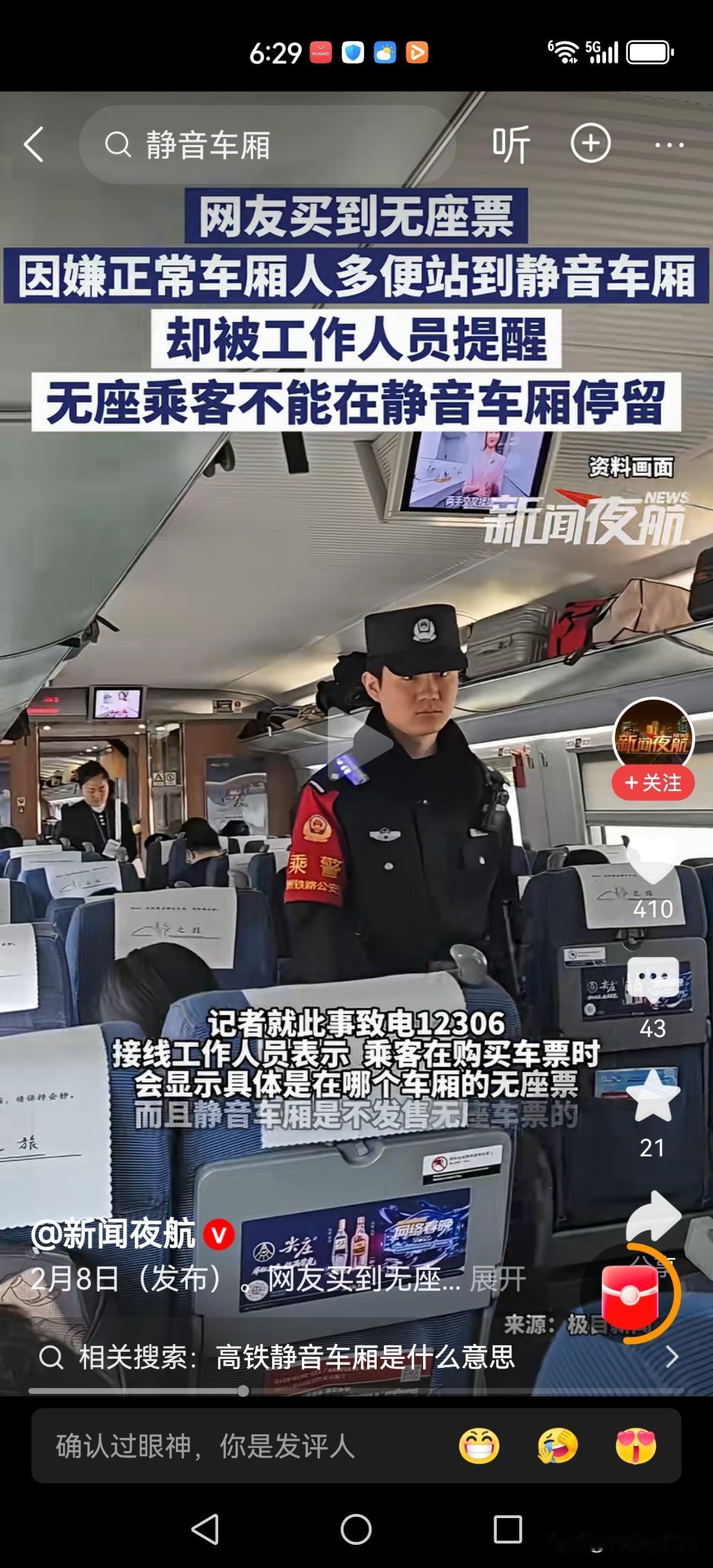 无座乘客进静音车厢被劝离有人持高铁无座票,见普通车厢人多便站去静音车厢,