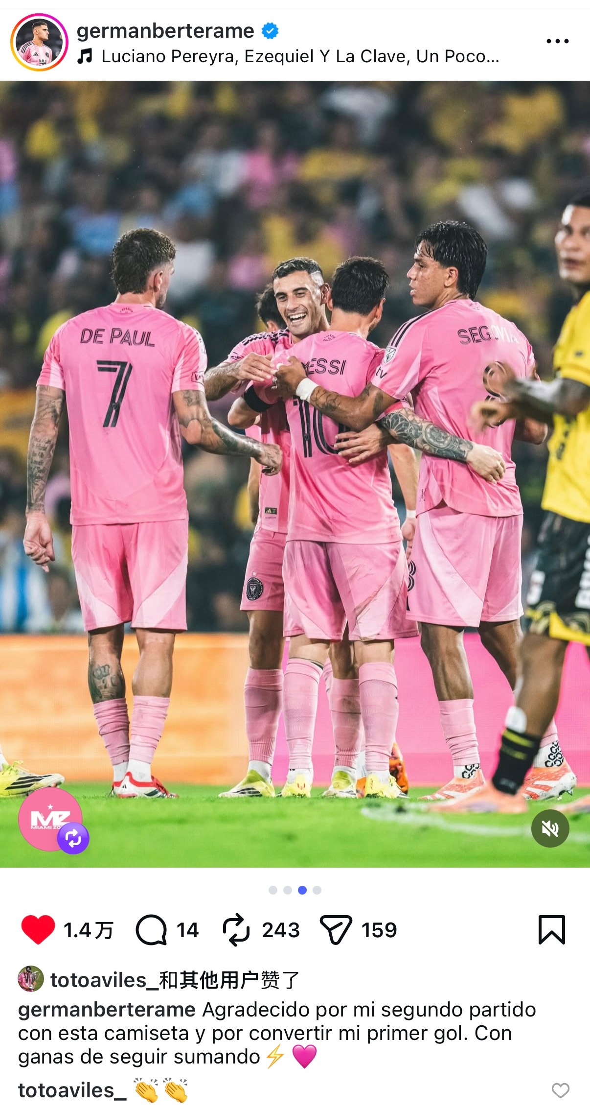 赫尔曼·贝尔泰拉梅(Germán Berterame)更新ins|很荣幸能穿上这件球衣参加第二场比赛,并打入我的第一个进球。期待继续增加我的进球数⚡️🩷
