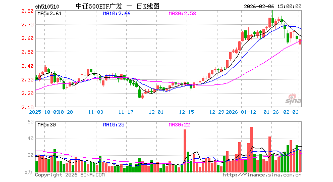 2月6日,中证500ETF广发(510510)涨0.00%,成交额6885.20万元。当日份额增加1000.00万份,最新份额为9.91亿份,近20个交易日份额增加1.22亿份。最新资产净值计算值为25.72亿元。