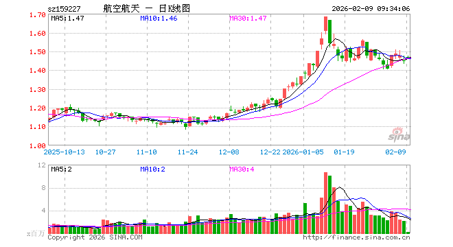 2月9日,航空航天ETF(159227)开盘涨1.52%,报1.467元。航空航天ETF(159227)重仓股方面,光启技术开盘涨1.46%,中国卫星涨1.92%,航天电子涨2.65%,航发动力涨1.96%,中航沈飞涨0.96%,航天发展涨1.61%,中航西飞涨1.20%,中航机载涨2.21%,上海瀚讯涨1.62%。