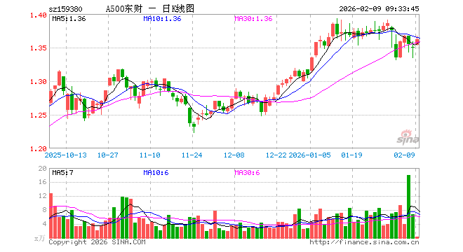 2月9日,A500ETF东财(159380)开盘涨0.30%,报1.354元。A500ETF东财(159380)重仓股方面,宁德时代开盘涨0.38%,贵州茅台涨0.20%,中国平安涨0.82%,中际旭创涨3.89%,紫金矿业涨3.50%,招商银行涨0.00%,新易盛涨4.37%,美的集团跌0.45%,兴业银行涨0.00%,长江电力涨0.04%。