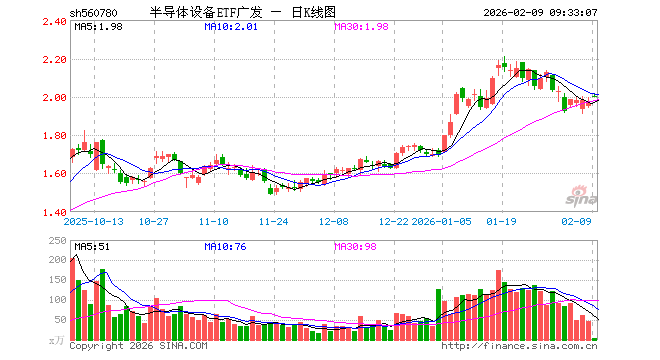 2月9日,半导体设备ETF广发(560780)开盘涨1.68%,报2.000元。半导体设备ETF广发(560780)重仓股方面,北方华创开盘涨1.45%,中微公司涨1.62%,拓荆科技涨1.72%,长川科技涨2.36%,沪硅产业跌0.77%,华海清科涨2.05%,中科飞测涨2.08%,南大光电涨4.30%,安集科技涨1.85%,芯源微涨5.42%。