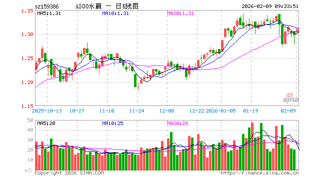 2月9日,A500ETF永赢(159386)开盘涨0.46%,报1.303元。A500ETF永赢(159386)重仓股方面,宁德时代开盘涨0.38%,贵州茅台涨0.20%,中国平安涨0.82%,中际旭创涨3.89%,紫金矿业涨3.50%,招商银行涨0.00%,新易盛涨4.37%,美的集团跌0.45%,兴业银行涨0.00%,长江电力涨0.04%。
