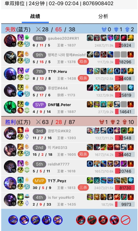 直播吧2月9日讯根据韩服排位统计小程序显示,Peyz韩服单排,使用芸阿娜砍下30-5-9的华丽战绩!