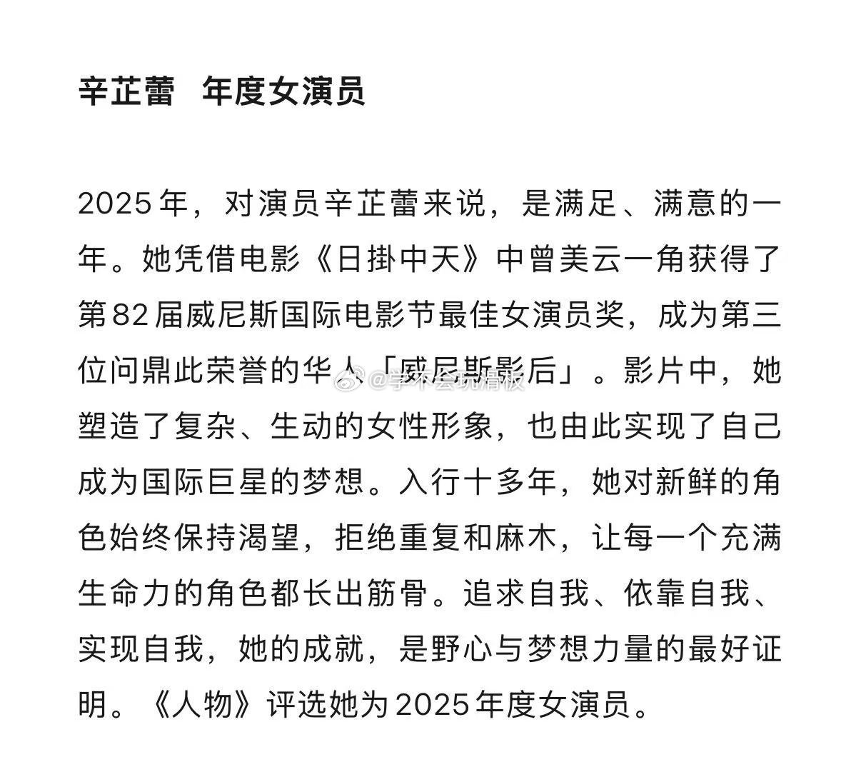 辛芷蕾  年度女演员2025年,对演员辛芷蕾来说,是满足、满意的一年。她凭借电影《日掛中天》中曾美云一角获得了第82届威尼斯国际电影节最佳女演员奖,成为第三位问鼎此荣誉的华人「威尼斯影后」。影片中,她塑造了复杂、生动的女性形象,也由此实现了自己成为国际巨星的梦想。入行十多年,她对新鲜的角色始终保持渴望,拒绝重复和麻木,让每一个充满生命力的角色都长出筋骨。追求自我、依靠自我、实现自我,她的成就,是野心与梦想力量的最好证明。《人物》评选她为2025年度女演员。