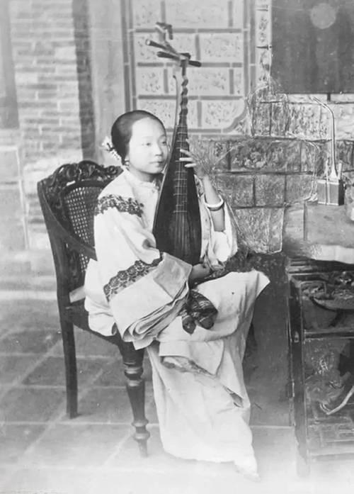 这是一张拍摄于清末民初江南地区的影像,画面中的女性是当时高级歌伎(又称“书寓先生”或“倌人”),她手持的琵琶是江南歌伎必备的表演技艺之一。 晚清江南的歌伎分为“书寓”“长三”“幺二”等不同等级,照片中的女性属于“书寓”阶层——这是歌伎中的最高等级,以曲艺、诗词为核心技艺,“卖艺不卖身”是其基本职业准则,主要为文人雅士的宴饮、雅集场合表演。