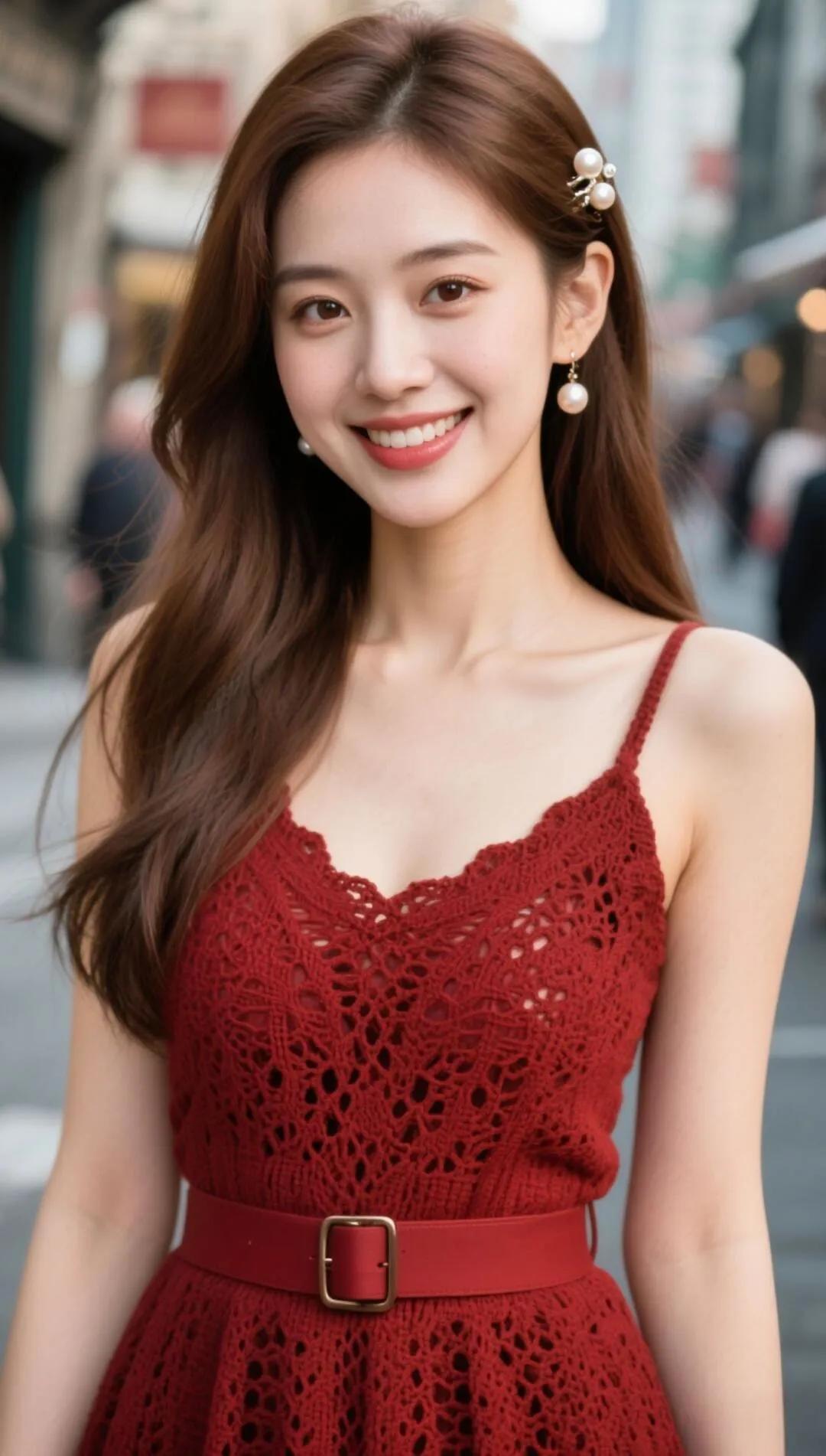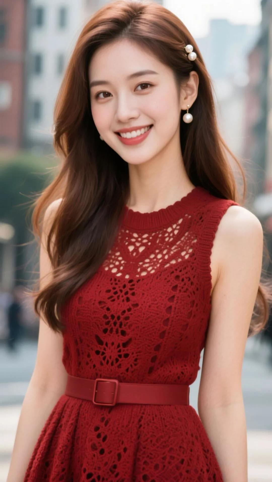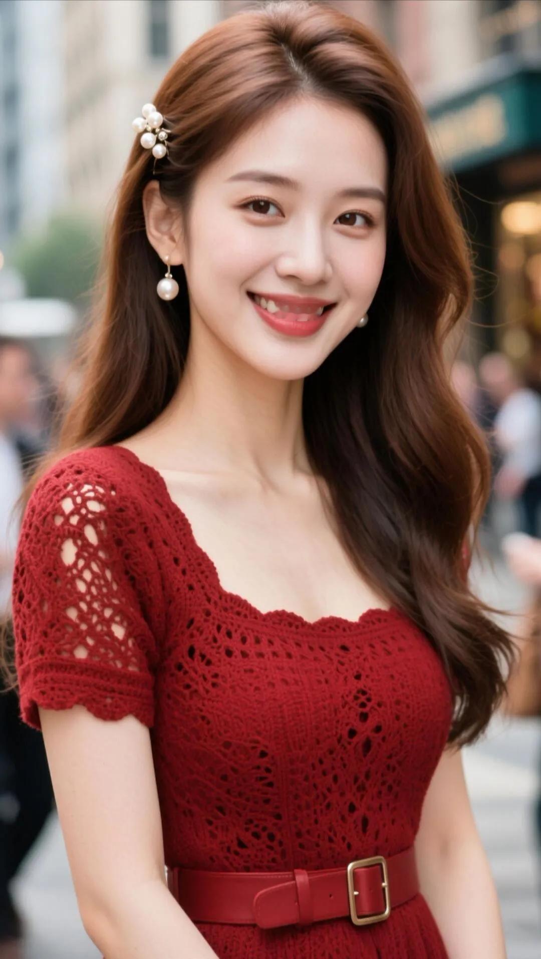 甜美少女风,红色蕾丝连衣裙,都市街拍,微笑动人